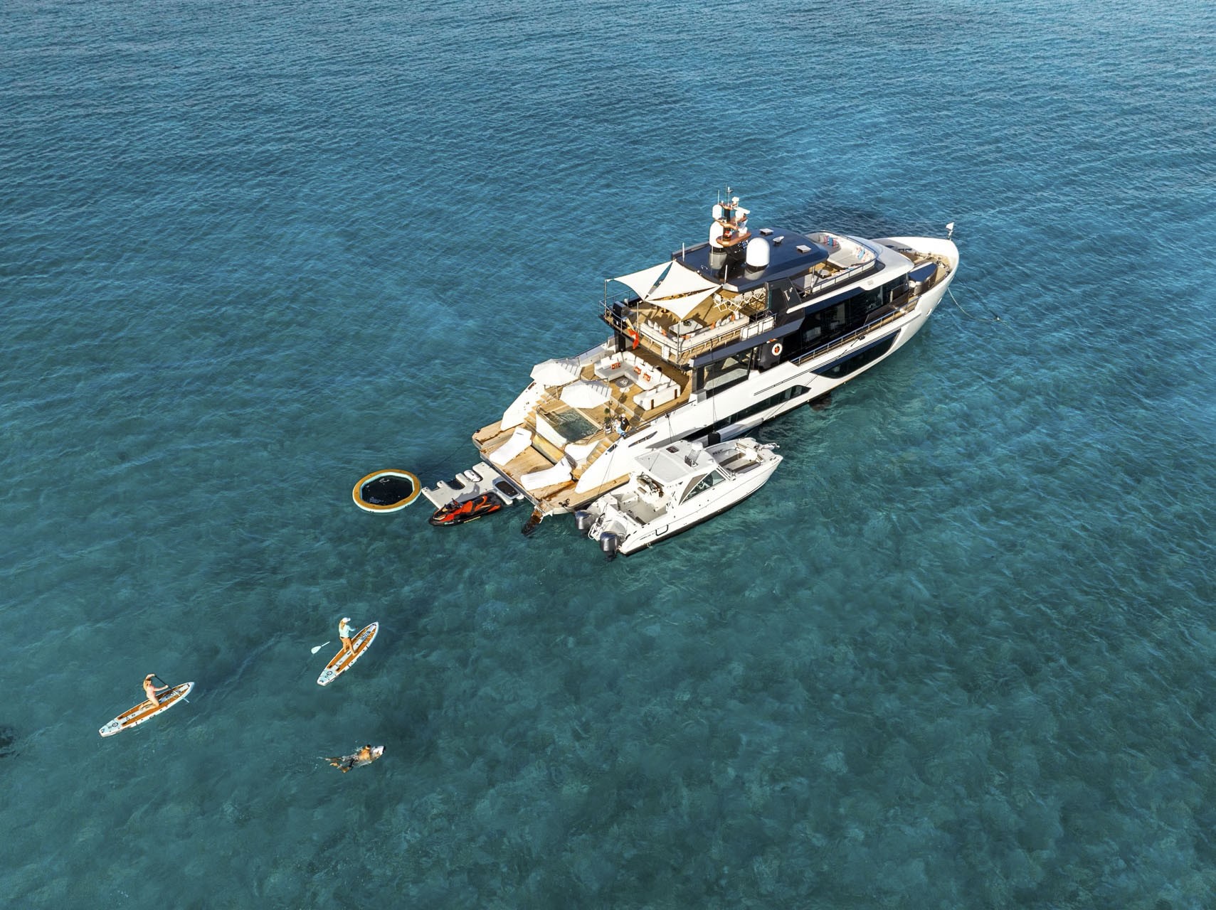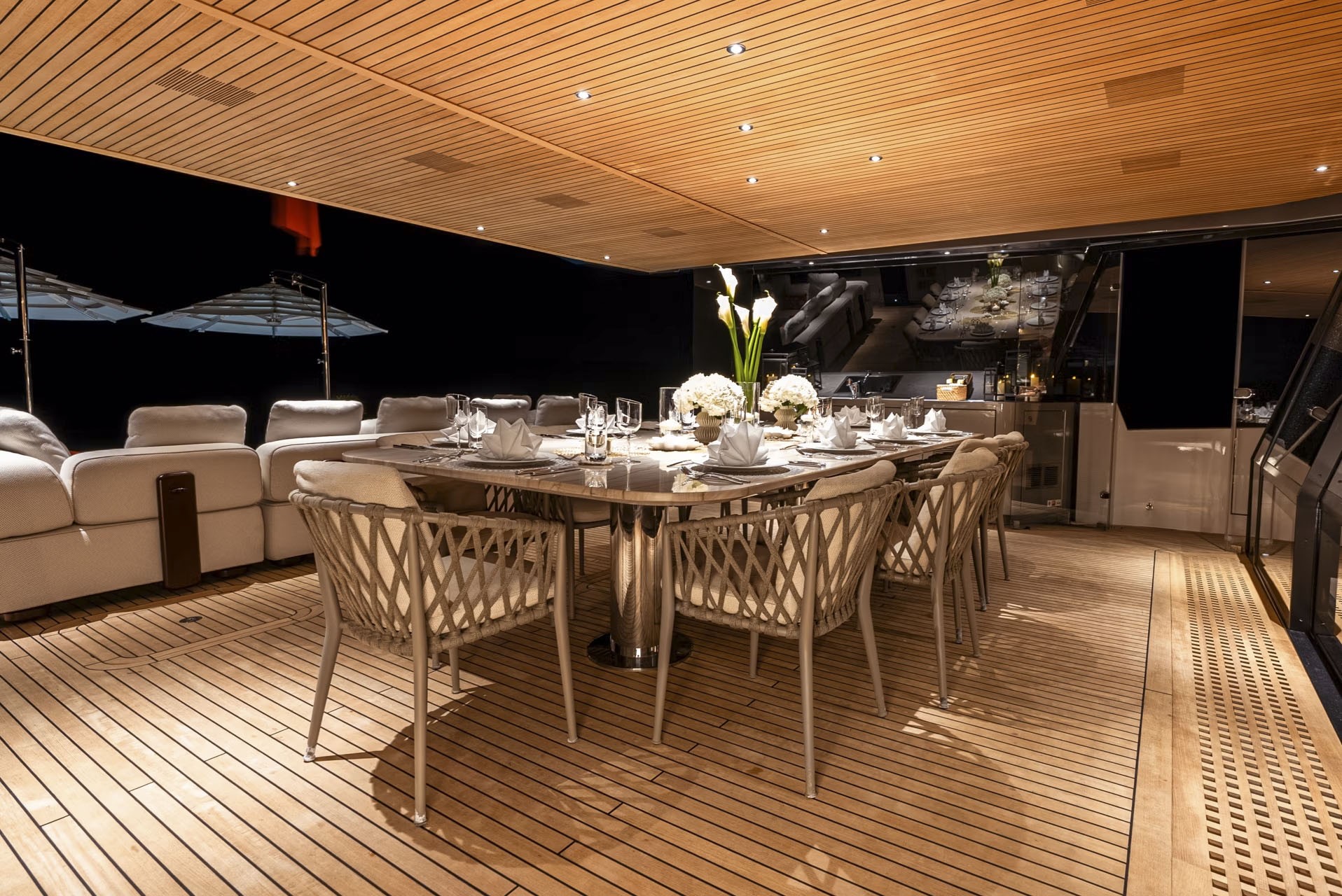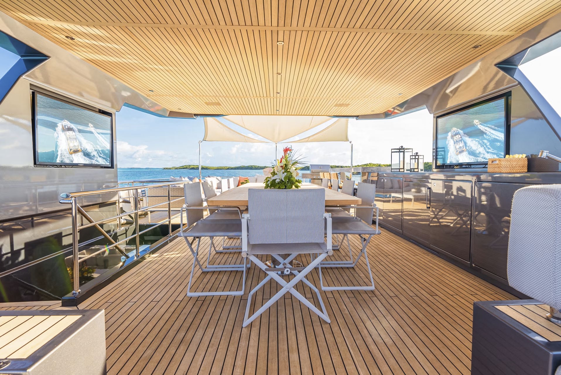 The epitome of al fresco living unfolds on her main deck aft, truly the place to be for a sublime dining experience. Just beyond the salon doors, is an outdoor dining haven, sheltered from the elements. Extending aft from the dining area, a generously sized seating space with overhead coverage and large heated pool shaded by two umbrellas. Descending a few steps leads to the swim platform at the water's edge, facilitated by a hydraulic platform for easy access to water toys.
