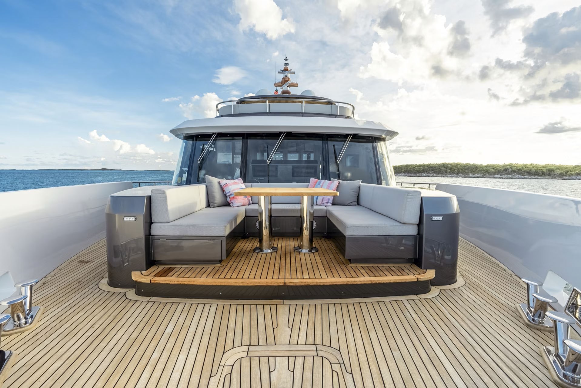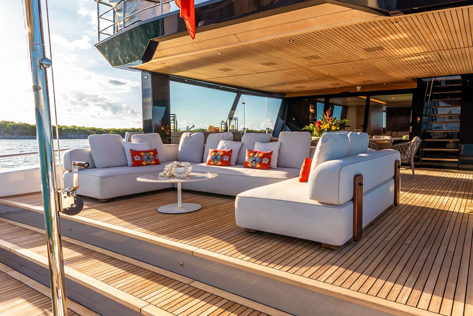 Inside, she boasts a modern and inviting interior. Her main salon features neutral-colored furniture, warm woods, and pops of color. Guests can relax in style or enjoy entertainment without compromising the stunning views through floor-to-ceiling windows. Her chic aesthetic provides a contemporary ambiance that is simultaneously comfortable and relaxing.