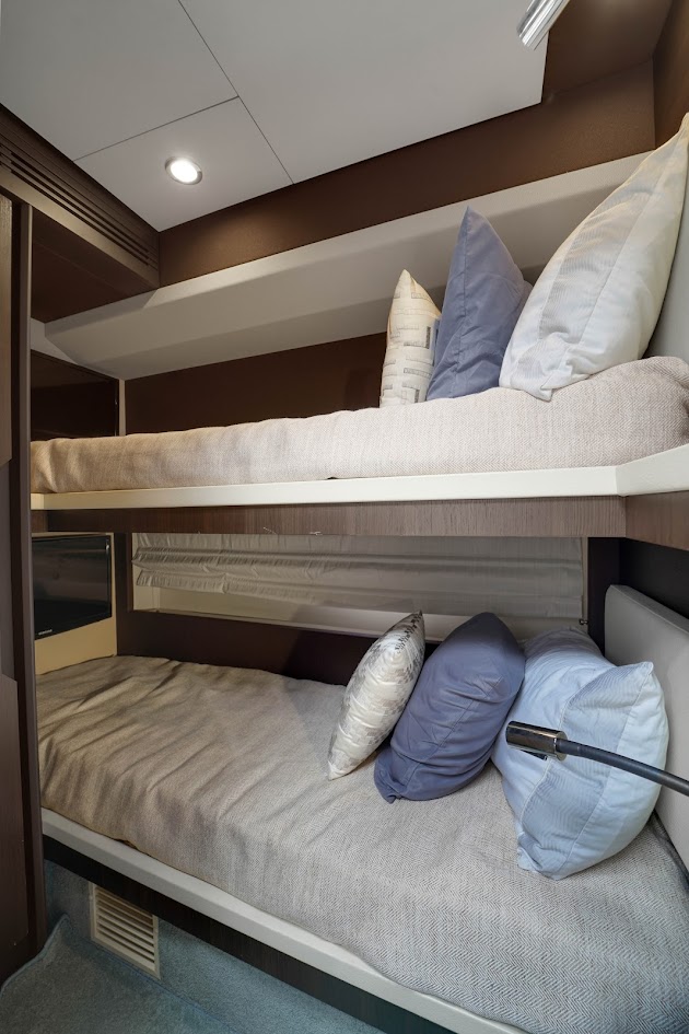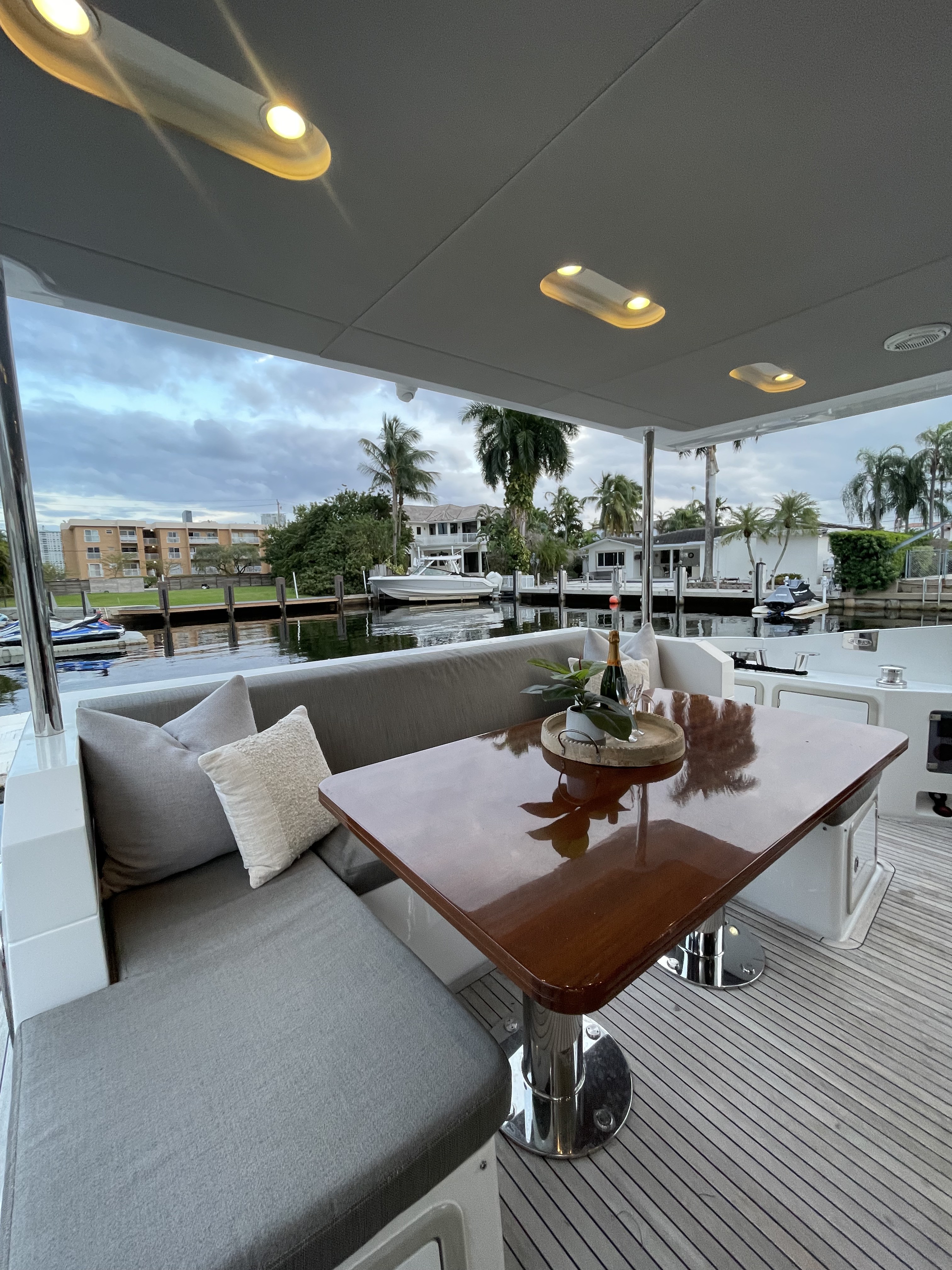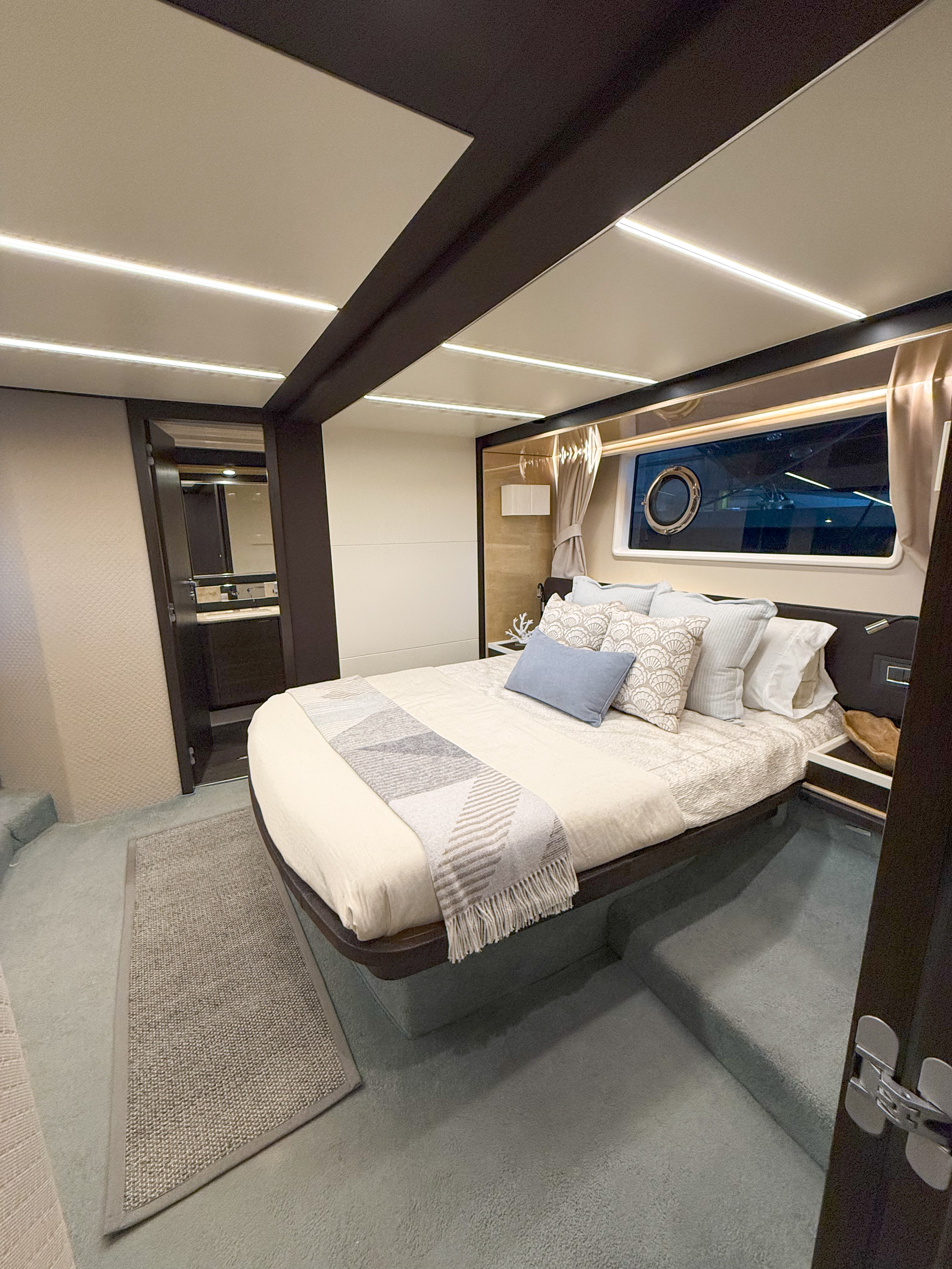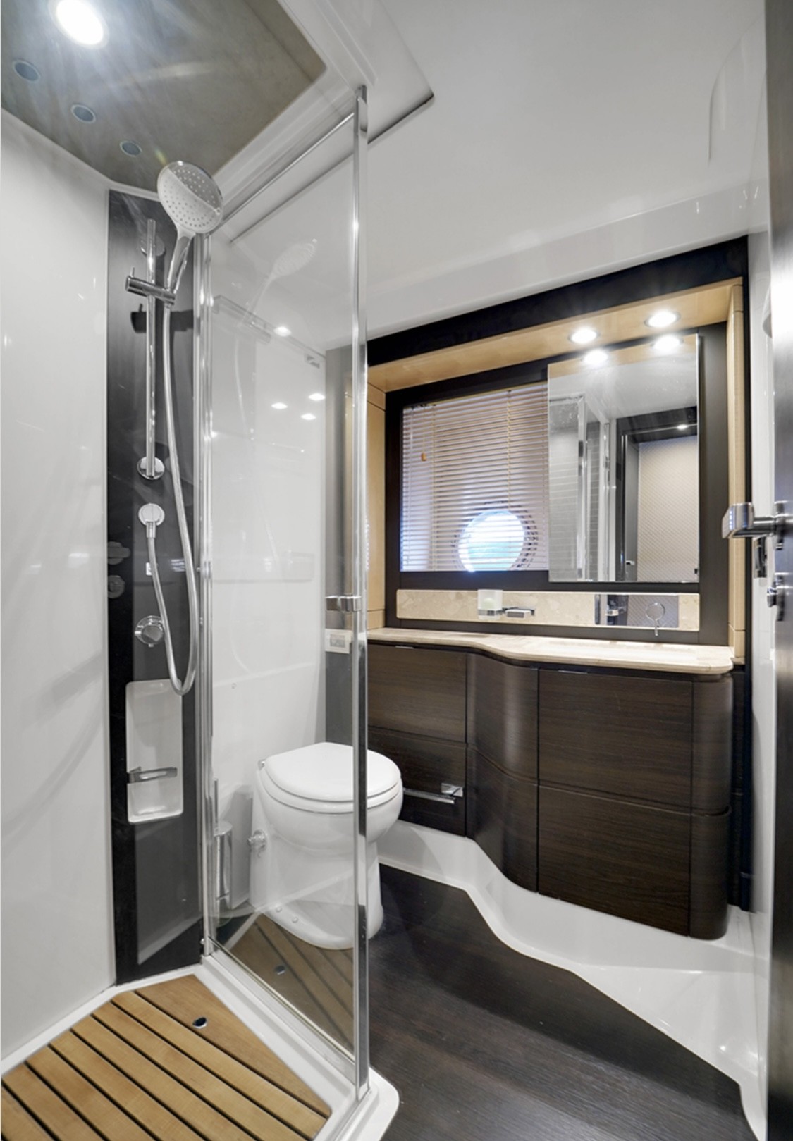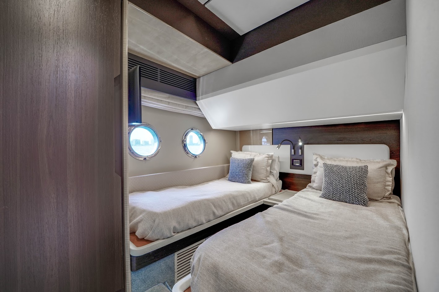 Accommodations aboard the 68' Azimut are designed to provide comfort and privacy for guests. The yacht offers four staterooms, each serviced with bathrooms and sophisticated amenities. The master suite is a luxurious retreat, featuring a king-size bed, ample storage space, and a private seating area.