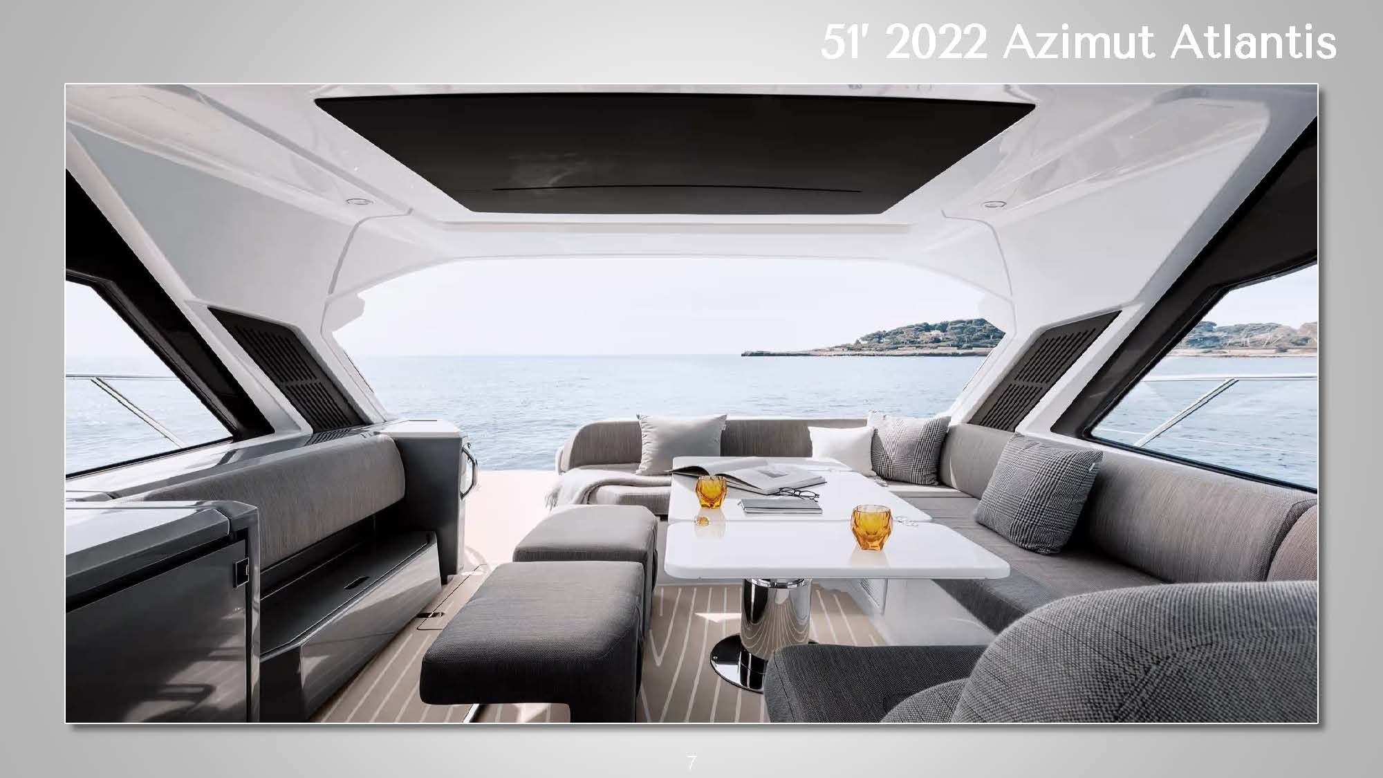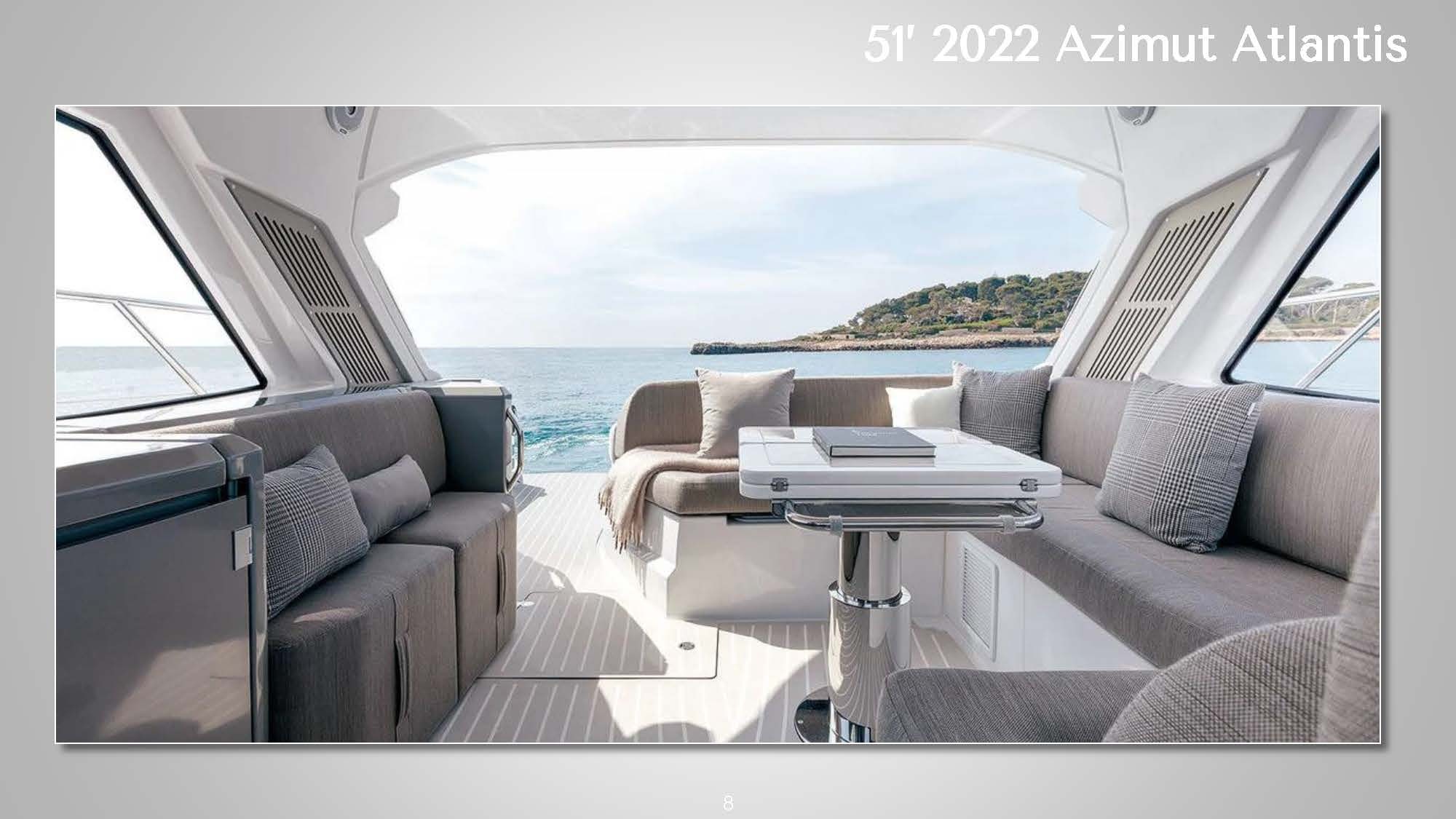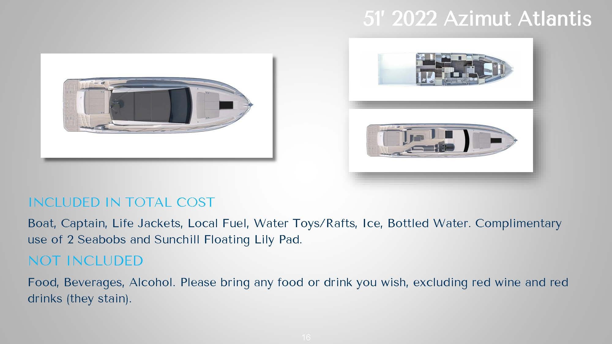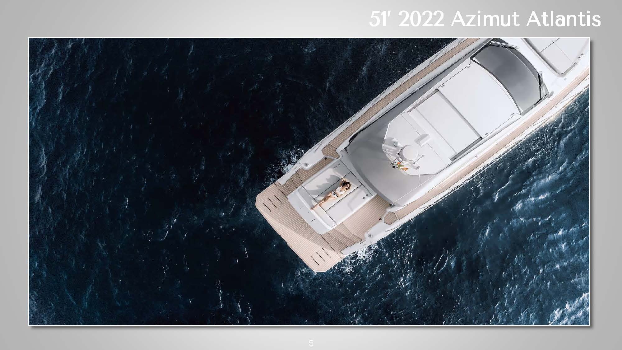 ![]() The 51' 2022 Azimut Atlantis's sleek design and contemporary lines seamlessly blend expert craftsmanship with exceptional performance on the water. The expansive cockpit boasts a generous seating area and a well-equipped wet bar, perfect for social gatherings or admiring the sunset on the horizon. A retractable hardtop roof offers versatility, providing shade or an open-air experience. This stylish Italian yacht allows guests to soak up the sun on either the bow or stern sun pads. Step inside the 51' 2022 Azimut Atlantis to discover a tastefully designed interior featuring high-quality finishes and materials. The salon is flooded with natural light, offering panoramic views through large windows. The well-appointed galley and dining area provide all the amenities necessary for preparing and enjoying meals onboard. The accommodations include three comfortable cabins, including a luxurious full-beam master suite. High-speed Starlink internet is also included to keep guests connected if needed. Whether cruising along the coast or venturing offshore, this yacht promises a smooth and enjoyable ride. The 51' 2022 Azimut Atlantis is a striking luxury sport cruiser that perfectly combines style, comfort, and performance. *This vessel's primary pickup location is in East Hampton but Sag Harbor arrangements can be made for an additional fee | 51' Azimut AtlantisNew England, NY, HamptonsCapacity Cruising: 13 Sleeping: 4 Staterooms: 3, Suite Bathrooms: 2 Beds: 1 King Bed, 1 Queen Bed Day: Captain, Stew, First Mate, 1 Chef Specifications Length: 51 Feet Beam: 15 Feet Draft: 5 Feet Year: 2022 Refit: 1980 Special Features Water Toys Underwater Scooter Tender: 14ft, 20hp Paddleboards: 1 Canoes: 1 Snorkel Gear for 1 Floating Water Mat Flight Boards: 1 Hydrofoil: 1 |
