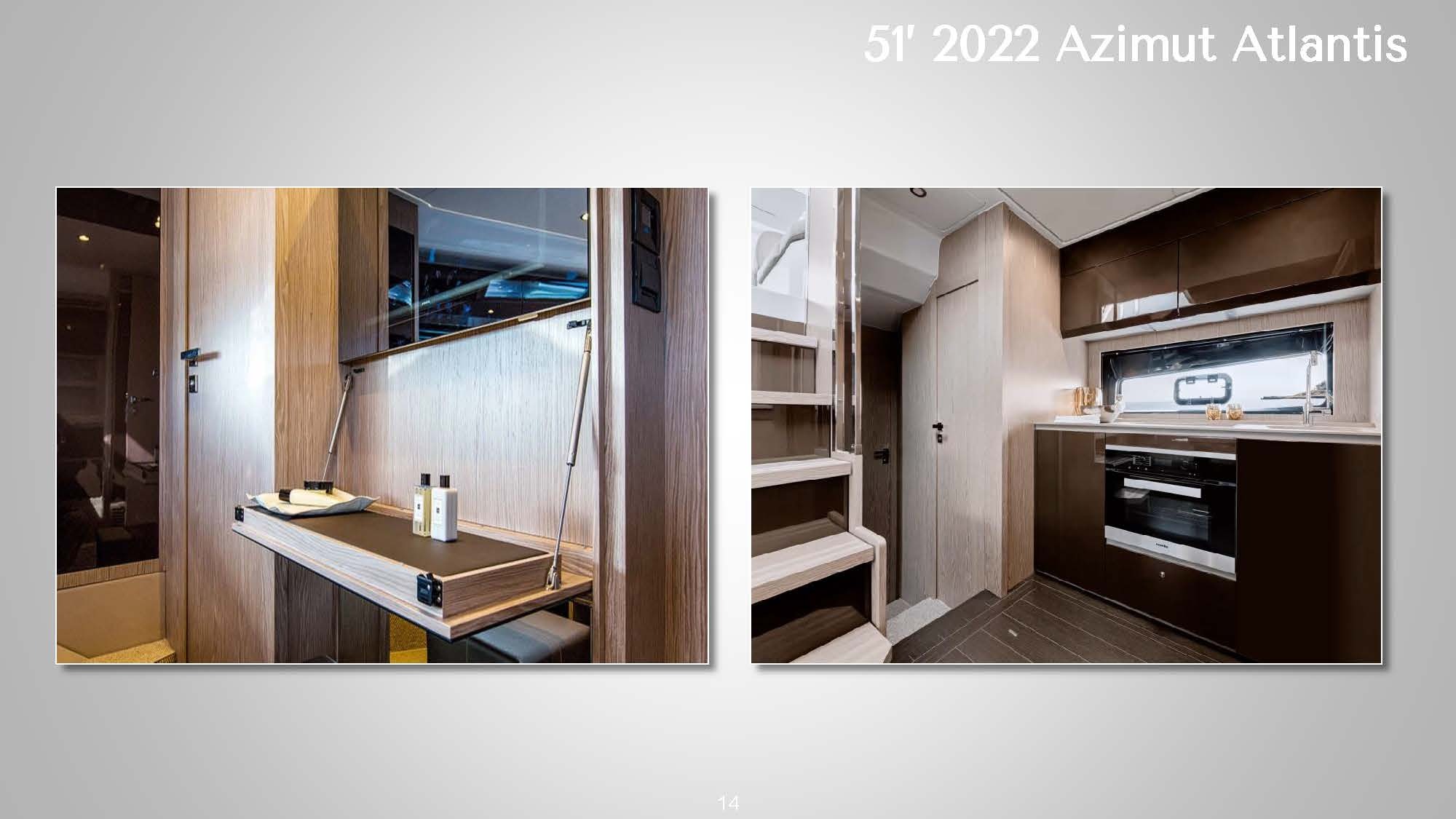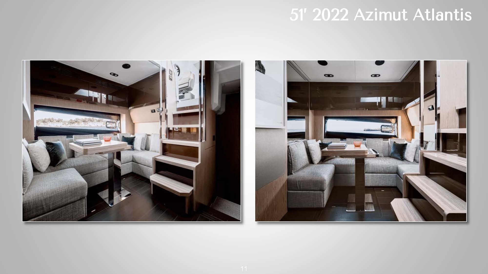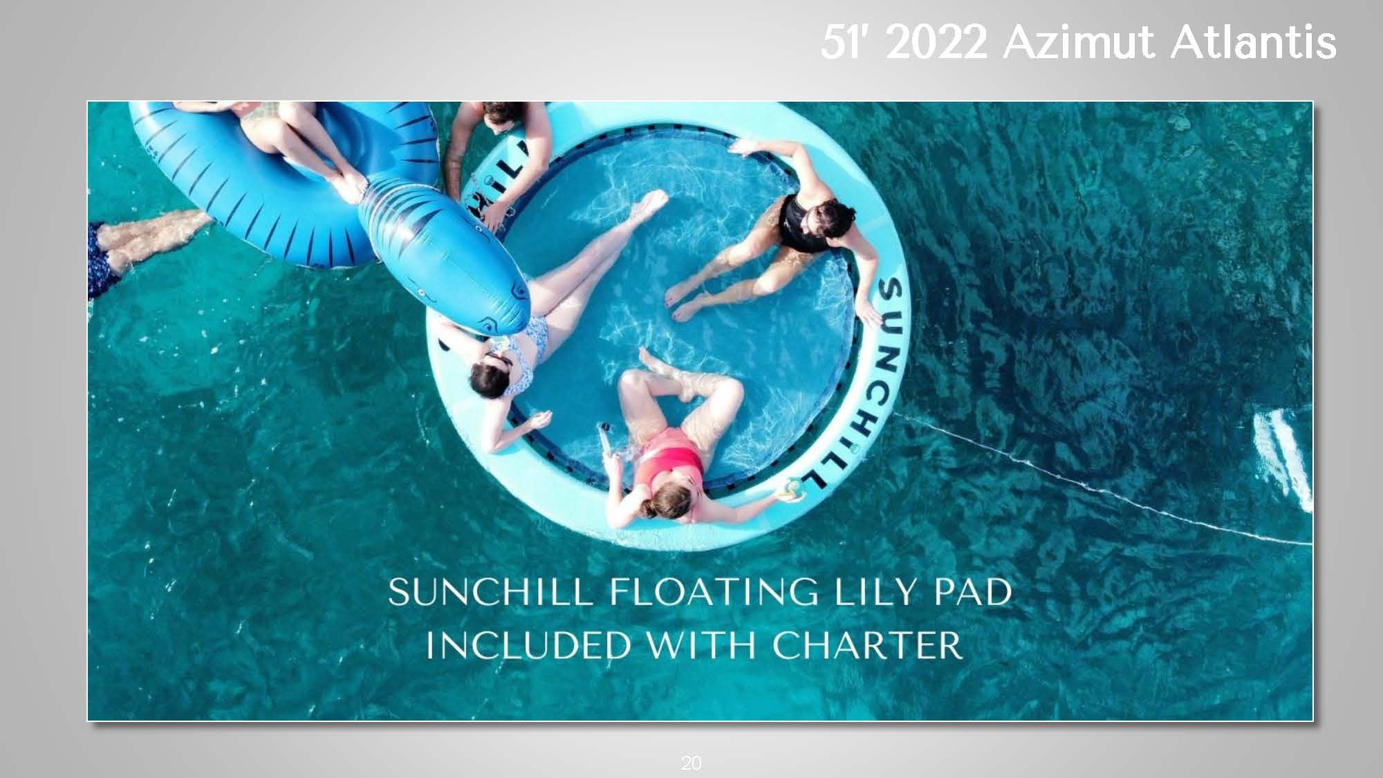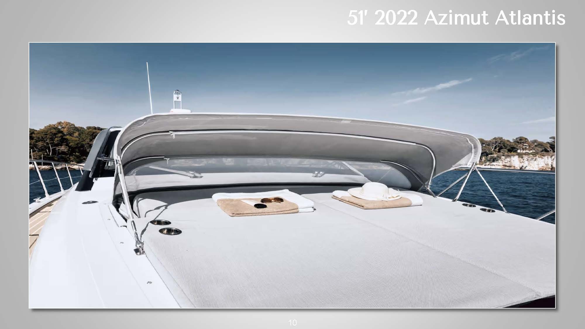 ![]() The 51' 2022 Azimut Atlantis's sleek design and contemporary lines seamlessly blend expert craftsmanship with exceptional performance on the water. The expansive cockpit boasts a generous seating area and a well-equipped wet bar, perfect for social gatherings or admiring the sunset on the horizon. A retractable hardtop roof offers versatility, providing shade or an open-air experience. This stylish Italian yacht allows guests to soak up the sun on either the bow or stern sun pads. Step inside the 51' 2022 Azimut Atlantis to discover a tastefully designed interior featuring high-quality finishes and materials. The salon is flooded with natural light, offering panoramic views through large windows. The well-appointed galley and dining area provide all the amenities necessary for preparing and enjoying meals onboard. The accommodations include three comfortable cabins, including a luxurious full-beam master suite. High-speed Starlink internet is also included to keep guests connected if needed. Whether cruising along the coast or venturing offshore, this yacht promises a smooth and enjoyable ride. The 51' 2022 Azimut Atlantis is a striking luxury sport cruiser that perfectly combines style, comfort, and performance. *This vessel's primary pickup location is in East Hampton but Sag Harbor arrangements can be made for an additional fee | 51' Azimut AtlantisNew England, NY, HamptonsCapacity Cruising: 13 Sleeping: 4 Staterooms: 3, Suite Bathrooms: 2 Beds: 1 King Bed, 1 Queen Bed Day: Captain, Stew, First Mate, 1 Chef Specifications Length: 51 Feet Beam: 15 Feet Draft: 5 Feet Year: 2022 Refit: 1980 Special Features Water Toys Underwater Scooter Tender: 14ft, 20hp Paddleboards: 1 Canoes: 1 Snorkel Gear for 1 Floating Water Mat Flight Boards: 1 Hydrofoil: 1 |