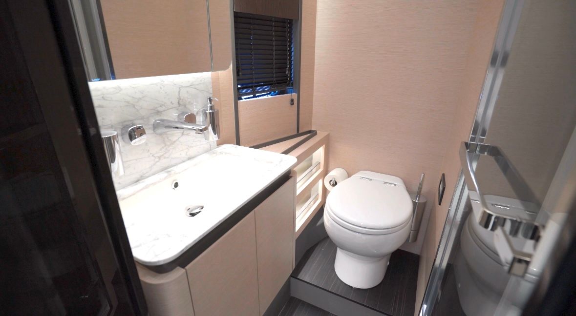 Inside, the yacht exudes Italian craftsmanship and contemporary design. The main salon is spacious and beautifully finished with high-quality materials such as fine woods, marble accents, and plush furnishings. Large windows and skylights enhance the sense of openness and flood the interior with natural light, creating a welcoming and airy atmosphere.
