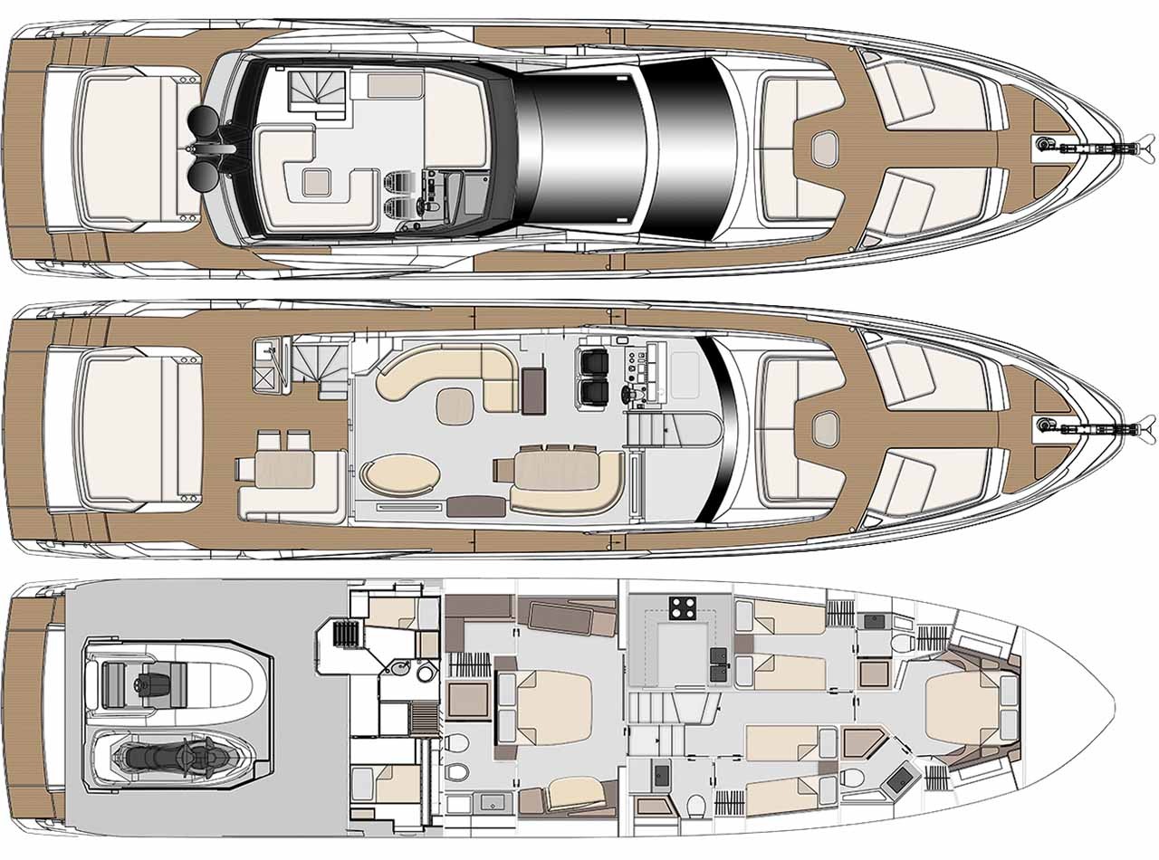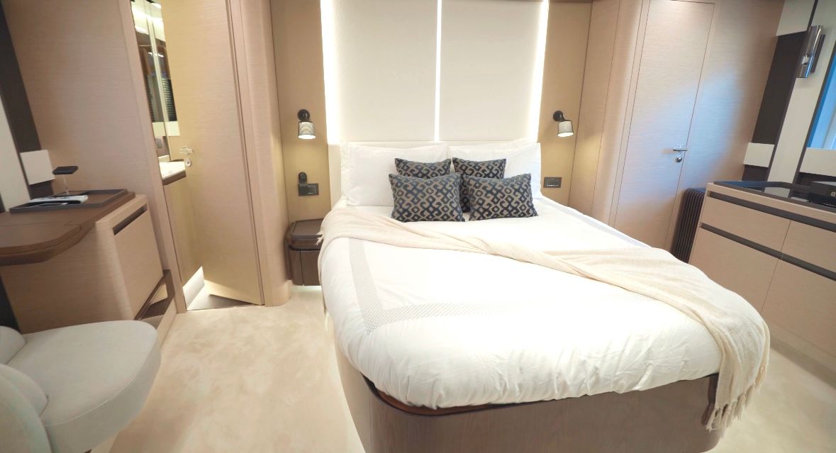 Accommodations are designed to pamper guests with comfort and privacy. The yacht features three staterooms that sleep 6 people, each equipped with luxurious en-suite bathrooms and sophisticated amenities. The master suite is a standout feature, offering a spacious retreat with a queen/king-size bed, ample storage space, and panoramic views of the sea.
