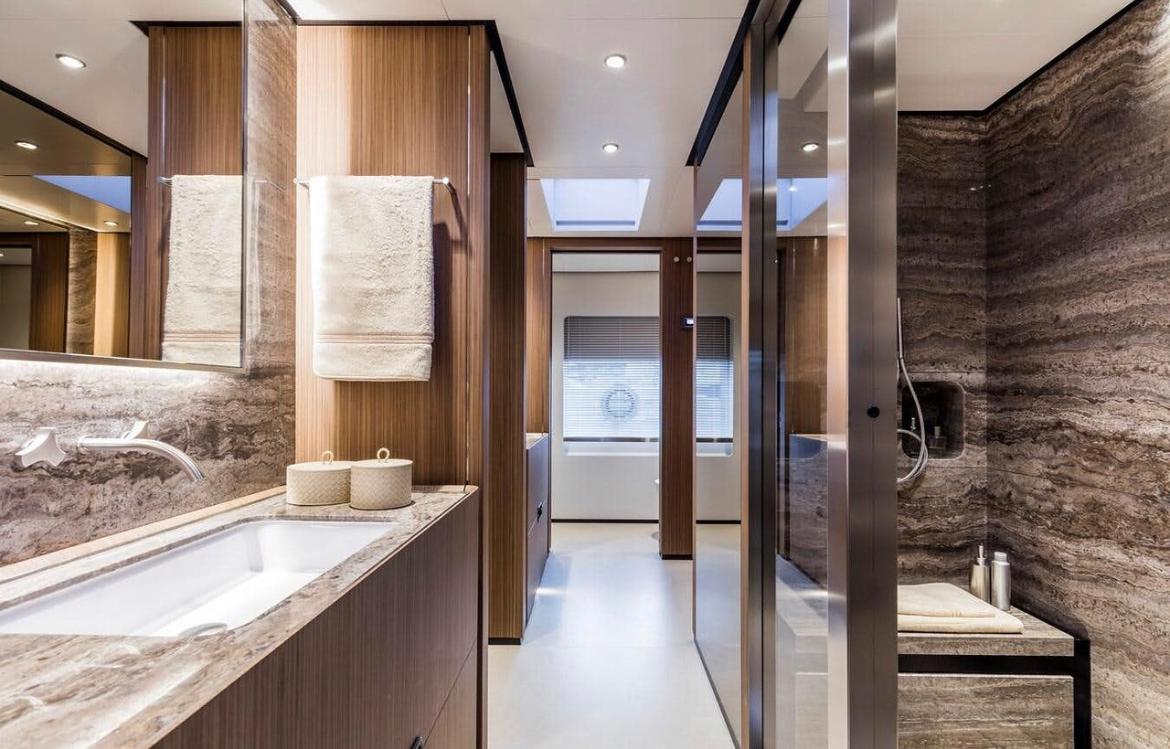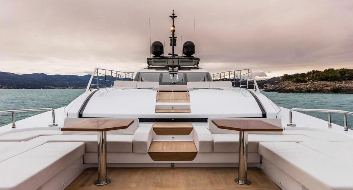 This yacht features a sundeck with a jacuzzi, a spacious beach club, and state-of-the-art entertainment system, among many other amenities.