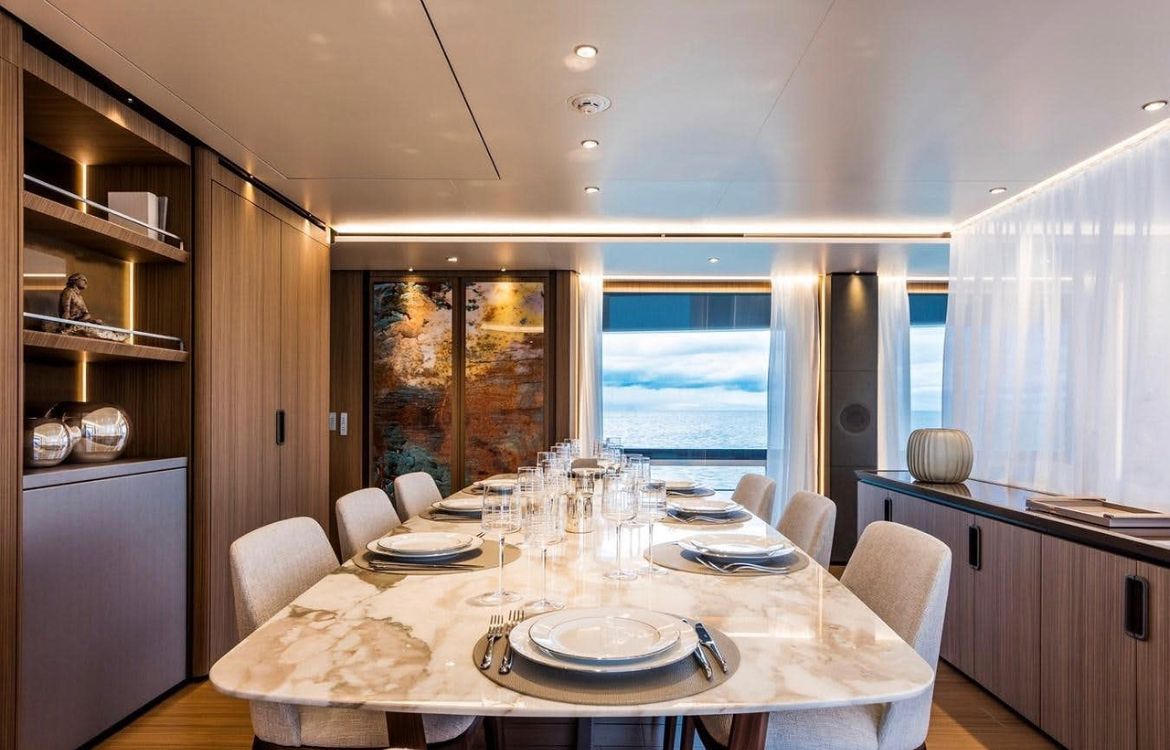 One of the very unique aspects of this yacht is that it can sit 10-12 guests for dinner or lunch on the aft deck, so that your guests can all sit together while enjoying the incredible service in complete luxury.