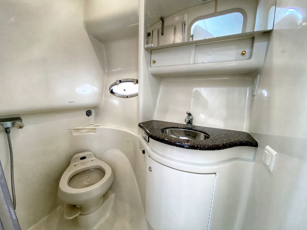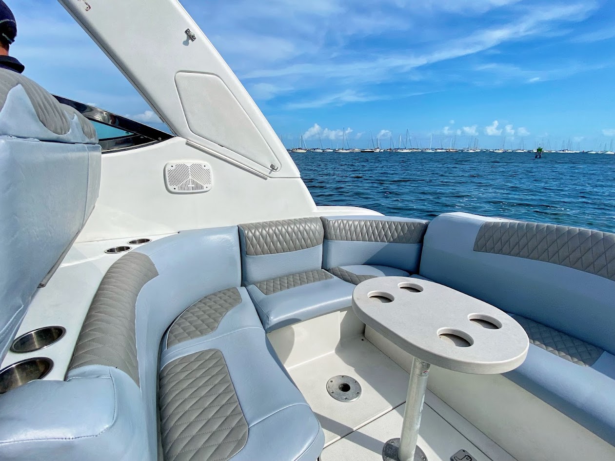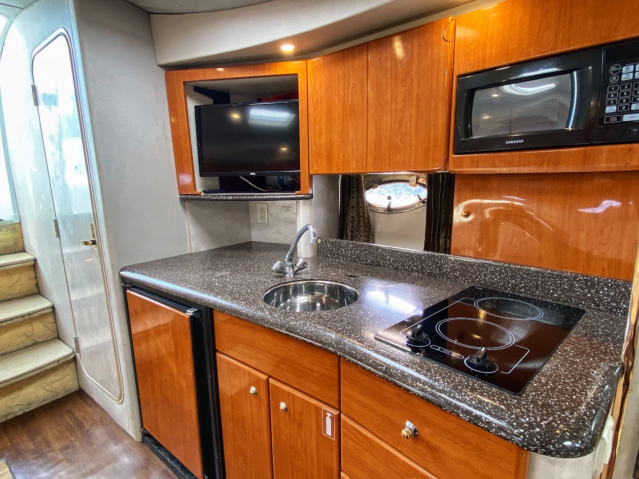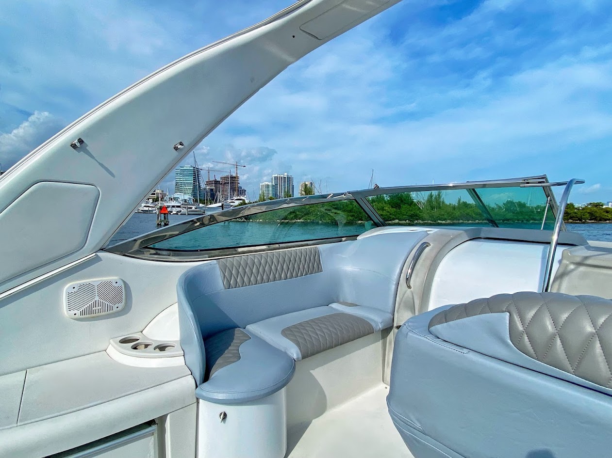 The Formula 40 PC is premium offshore express designed for those who place a priority on luxury and performance. Formula is the only builder in this class that offers standard Imron hull graphics. With 6'7"" of headroom below The cabin accommodations are a tasteful blend of high-gloss cherry cabinetry, Ultraleather upholstery, and high-end appliances and furnishings. The crescent-shaped dinette features a solid cherry table. Formula’s fully equipped galley includes a stainless steel sink, under-counter refrigeration, tons of storage, and Corian countertop. Aft of the salon and down a step, the spacious mid-cabin area boasts a convertible U-shaped lounge with seating for six. A forward privacy curtain was standard in the Formula 40 PC . A walk-thru windshield provides easy access to the foredeck, and the U-shaped aft cockpit lounge converts to a huge sun pad. The extended swim platform will support a PWC. 40 Formula is a great sea boat that will get you where you want to go with style and speed.