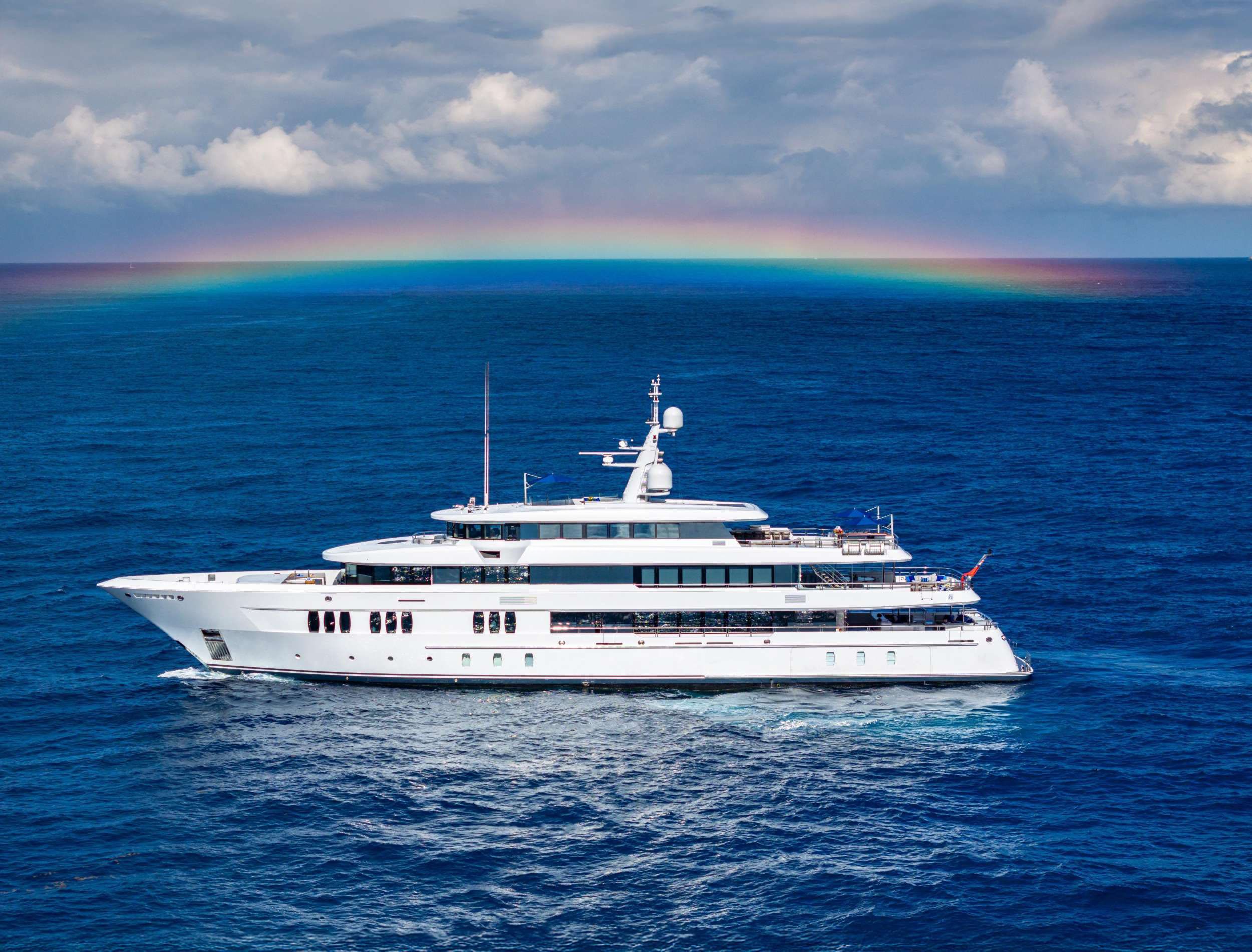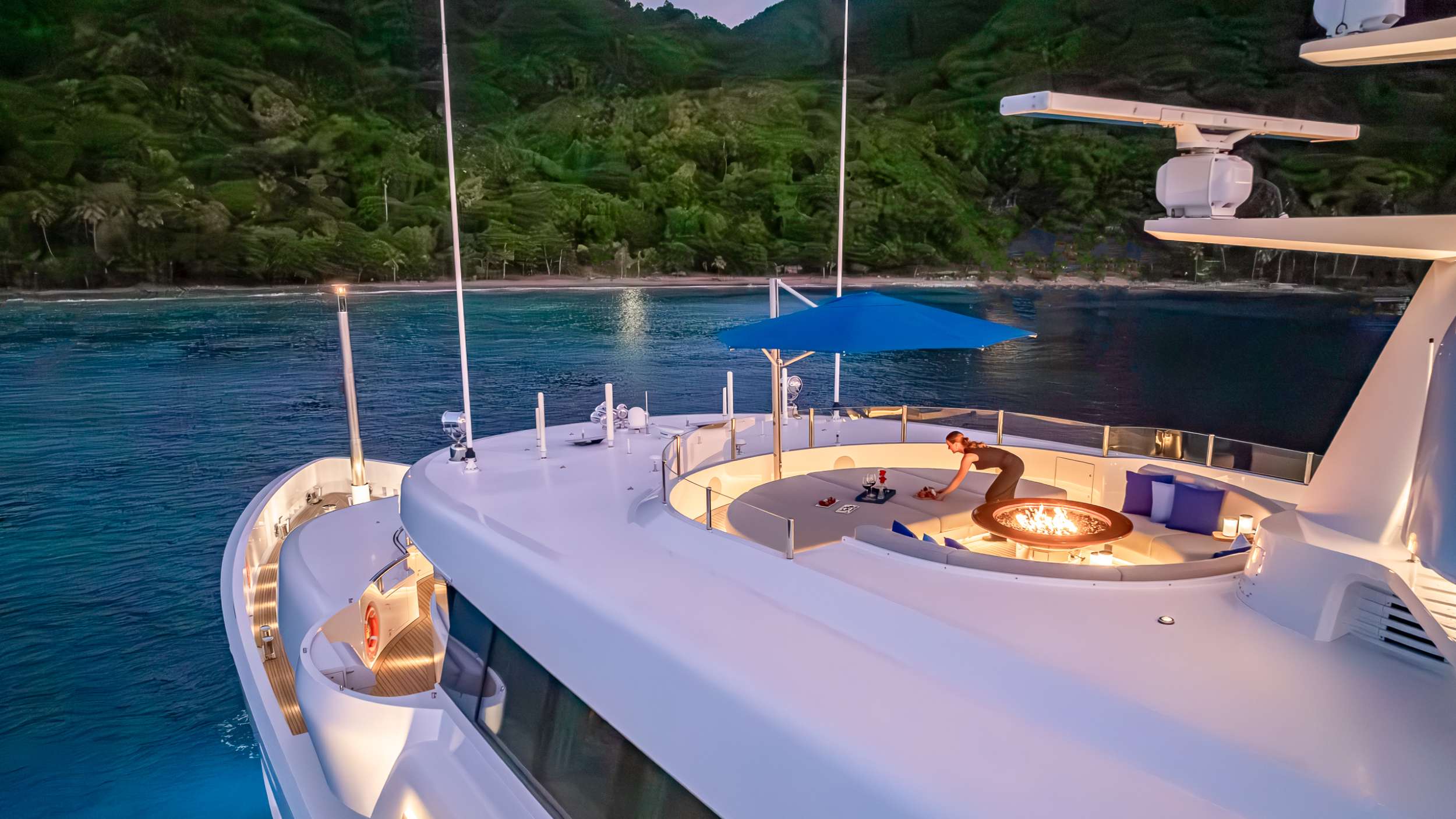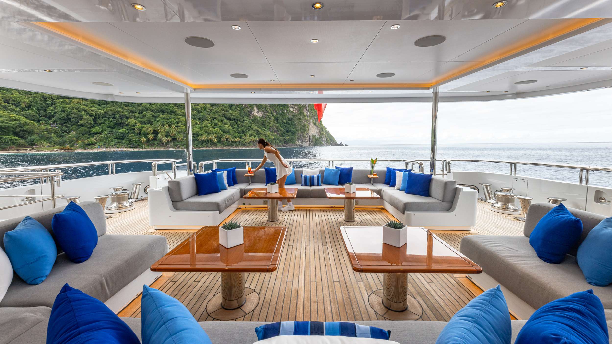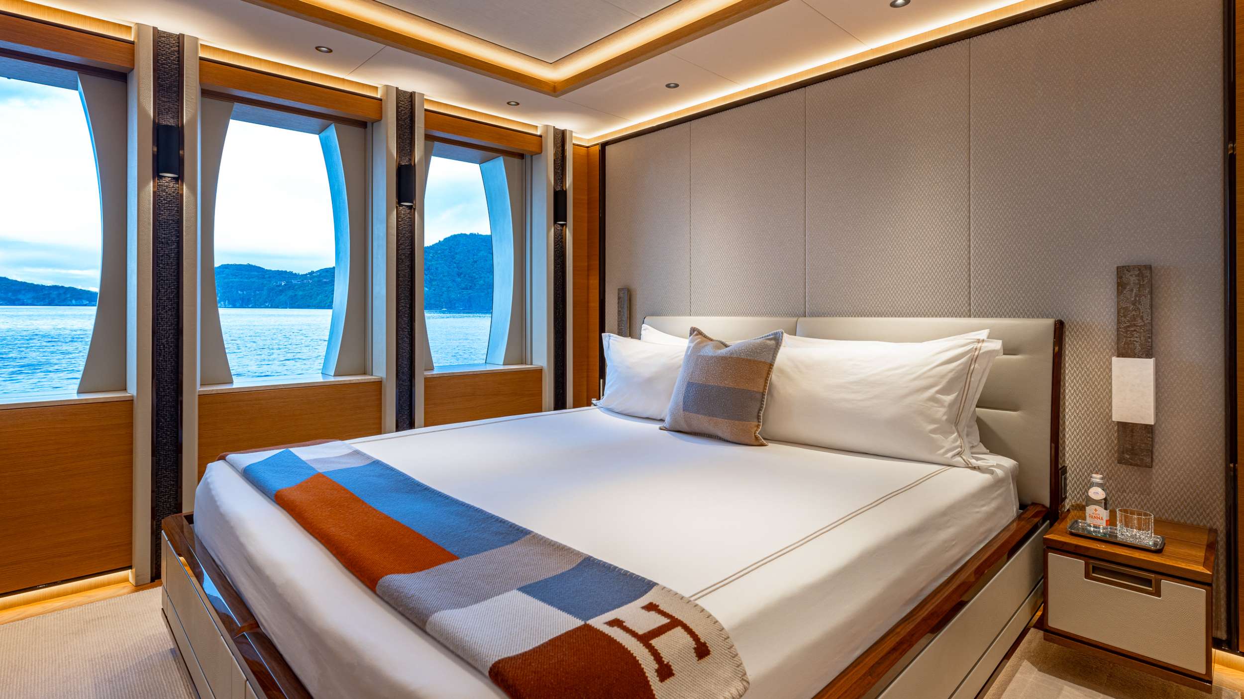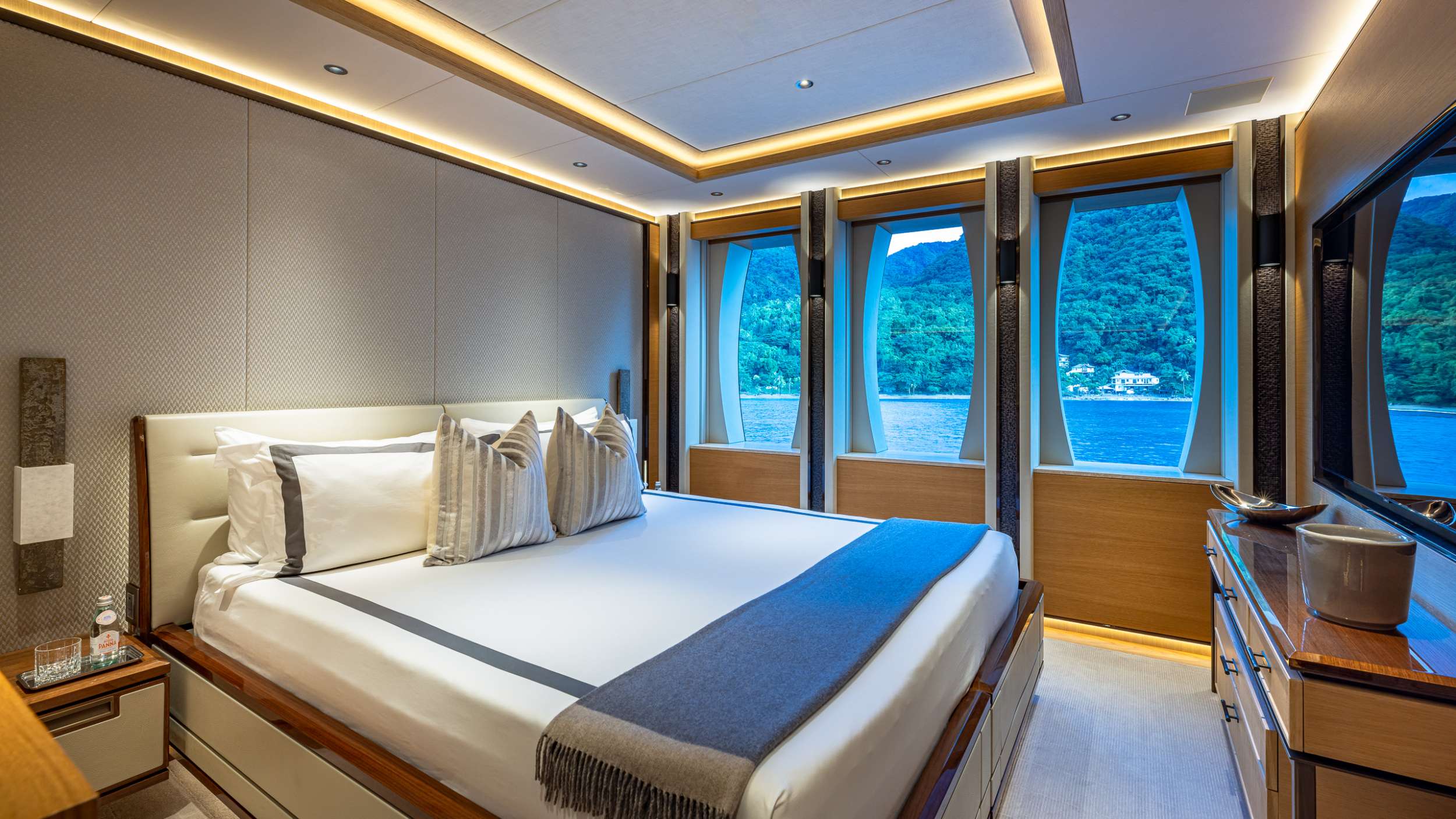 The Royal Hakvoort living spaces were designed with entertaining in mind. Formal dining areas are featured throughout the yacht. The galley is an open, socially-oriented space, that is also properly adapted for the onboard chef. A glass elevator reaches all decks onboard, transporting guests to any of the 5 decks. The dedicated owner's deck features a private dining area and a foredeck jacuzzi for privacy and relaxation. The large king bed is surrounded by 180-degree floor-to-ceiling windows allowing sunlight to illuminate the suite. Additional guest rooms offer convertible spaces to fit any combination of families, friends, or corporate charters. Each stateroom features large windows, providing a stunning view from every angle. One stateroom is wheelchair accessible. TOP FIVE II is also equipped with Starlink Maritime.