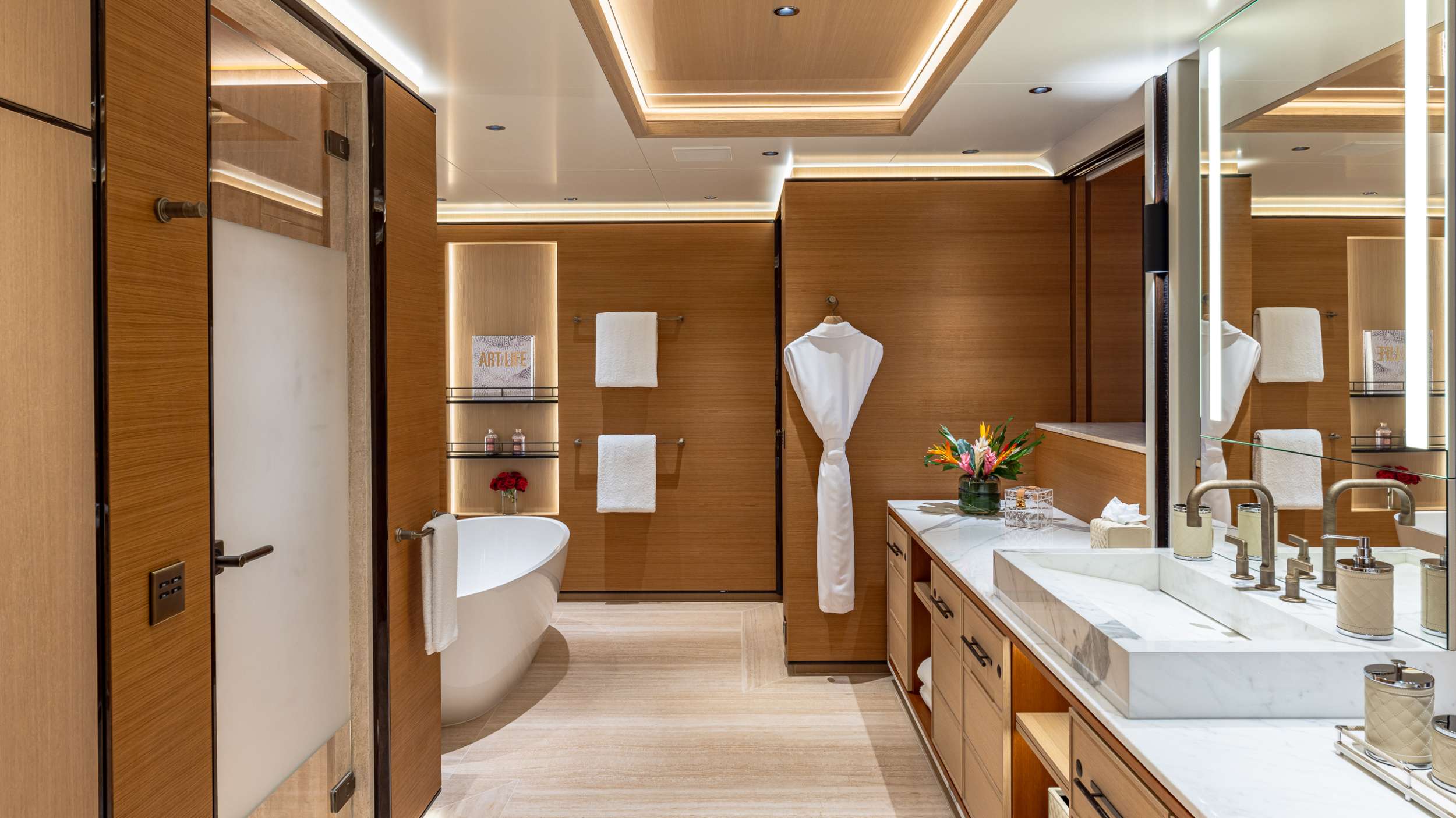 An impressive length of 200'2" (61m), the Royal Hakvoort yacht offers an array of standout amenities and reinforced hull, and immense ceiling heights throughout. Seven well-appointed guest suites and a dedicated owner’s deck provide plush accommodations for 12 onboard guests. TOP FIVE II’s voluminous interior was designed by Sinot Yacht and Architectural Design. Interior elements emulate warm and rich emotions by utilizing oak, walnut, and leather complemented with Italian marble and rich fabrics. Higher ceiling heights allow for larger windows, flooding the interior with natural light.