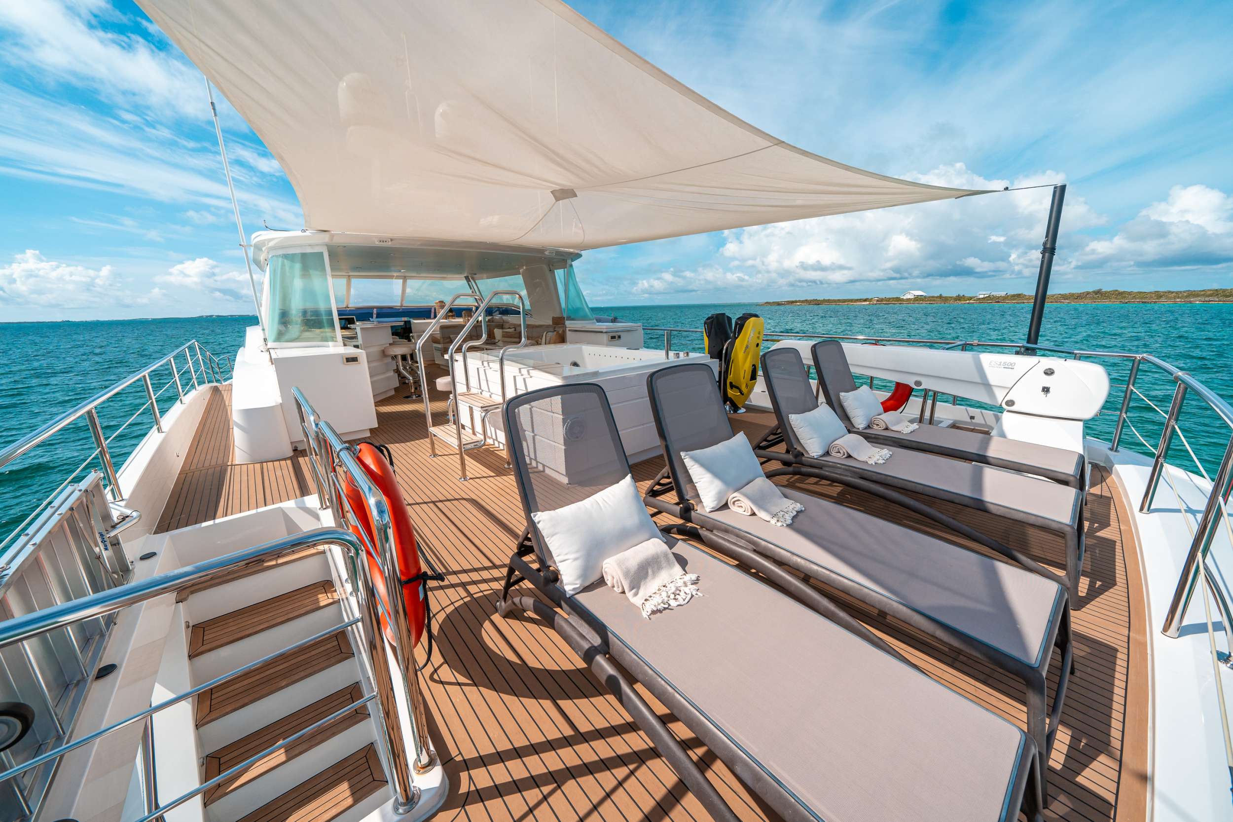 Experience refined luxury aboard this 85-foot Horizon motor yacht, designed for comfort and effortless entertaining. Expansive lounges and panoramic windows create a bright, open atmosphere, while four beautifully appointed ensuite staterooms accommodate up to eight guests. The on-deck master suite offers added privacy and convenience, delivering elevated comfort with stunning views. A professional captain and crew ensure seamless service and customize each itinerary to your preferences. Generous deck space invites sunbathing, cocktail hours, and alfresco dining. Enjoy paddleboards and snorkeling gear while cruising premier destinations from the Bahamas and Caribbean to New England and beyond in style.