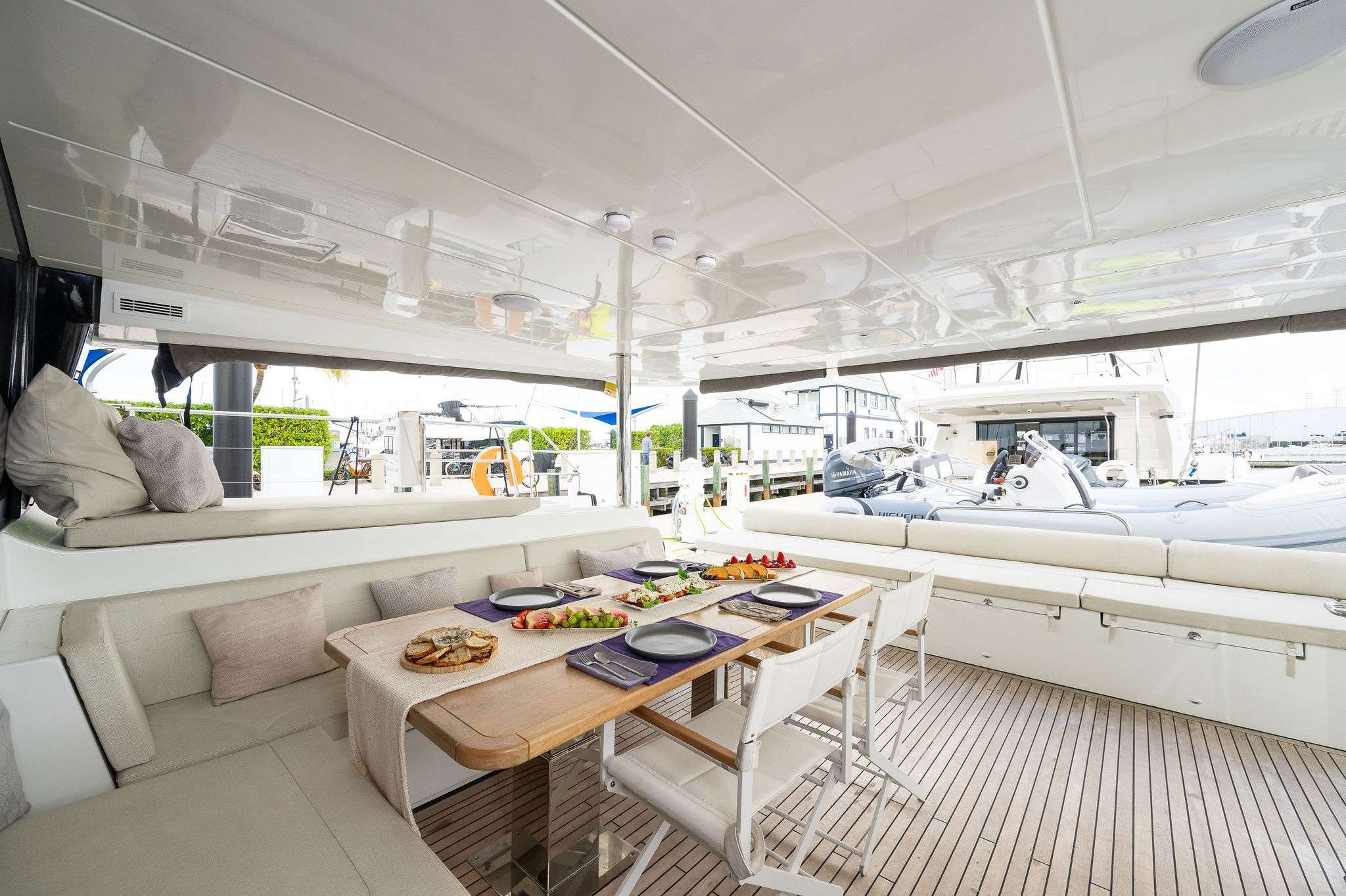 ![]() WHAT MAKES THE BENETEAU LAGOON SUCH A GREAT BOAT TO CHARTER Interior Comfort & Design: Spacious Saloon: Large windows flood the interior with natural light, offering panoramic sea views and a seamless connection to the cockpit via a large sliding door. Well-Equipped Galley: The U-shaped galley is designed for social cooking, equipped with a four-burner stove, dishwasher, ample storage, and multiple refrigerators. Luxurious Cabins: SLEEPS 10 people in 5 cabins, each cabin boasts a queen-size bed and en-suite bathroom with separate showers. Outdoor Living & Social Spaces: Flybridge: The spacious flybridge serves as a central social hub, featuring a helm station, sunbeds, table and seating, and is has an enclosure for weather protection. Cockpit & Foredeck: The aft cockpit offers generous seating and dining areas, while the foredeck includes traditional trampolines and cushioned lounge chair seating, enhancing onboard relaxation. Robust Construction: The Lagoon is built with vacuum-infused polyester and a balsa core, ensuring durability and stability. Safety Features: Wide side decks, flush-mounted hatches, and handrails around the coach roof ensure easy and secure movement around the vessel. Ideal for Bluewater Cruising: Designed as a blue water cruiser, the Lagoon combines comfort, performance, and ease of handling, making it suitable for long-distance voyages and luxurious charters. This powered catamaran not only has comfort and style, but is loaded with water toys that include a jet ski, 13ft ski tender with an outboard motor, paddleboards, floating water mat, under water scooter( Sea Bob) and more. All multiple day charters come with a captain, mate, stew/chef. Guests can upgrade to a Michelin chef for the highest level of service and food choices. In summary, the Lagoon power catamaran excels in performance, comfort, and design, along with its incredible crew, makes this powered catamaran a top choice for charterers seeking a versatile, luxurious vessel, loaded with an array of great water toys. | 70' Lagoon BeneteauFlorida and The Keys Bahamas (Nassau)Capacity Cruising: 13 Sleeping: 10 Staterooms: 5, Suite Bathrooms: 7 Beds: 5 Queen Beds Day: Captain, First Mate Term: Captain, First Mate, 1 Stew/Chef Specifications Length: 70 Feet Beam: 33 Feet Draft: 5 Feet Year: 2020 Special Features Wifi Free Drone Photo Shoot Starlink Bluetooth Sound System Watermaker Satellite TV Streaming TV BBQ Grill Water Toys Jetski Seabob Tender: 13ft, 60hp Tubes + Towable Inflatables Paddleboards: 2 Snorkel Gear for 6 Floating Water Mat Pickup Address: Stock Island Marina, 6000 Peninsular ave, Key West Florida Secondary Pickup Address: Key West and Bahamas |