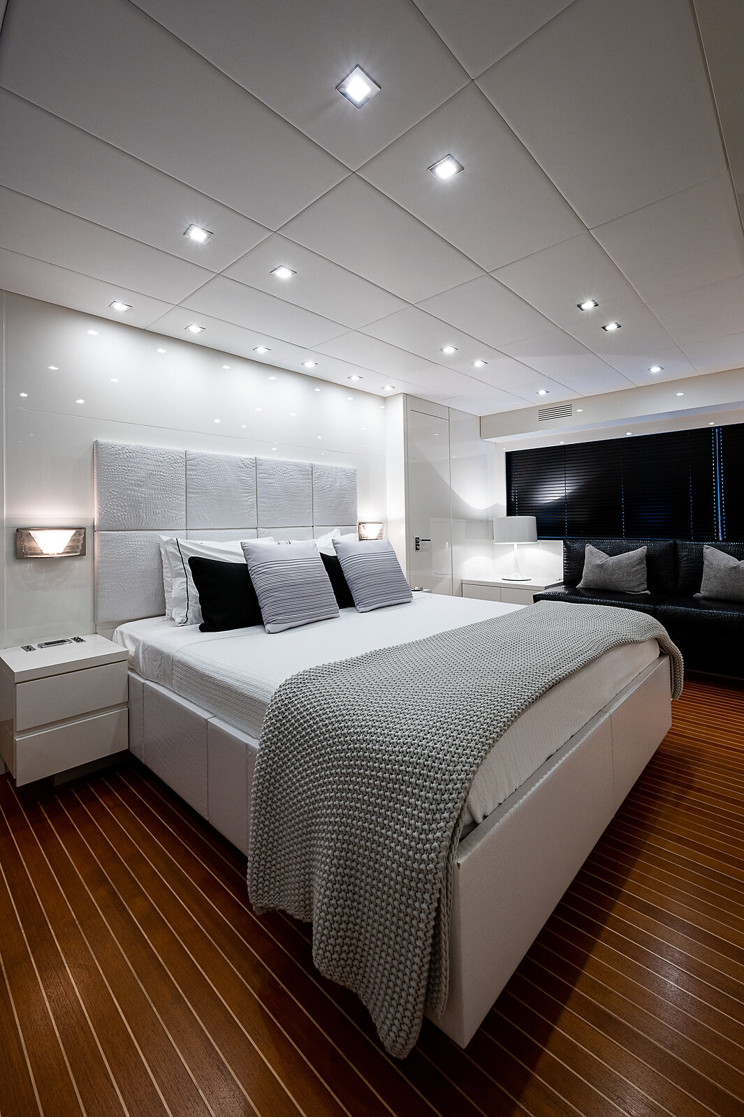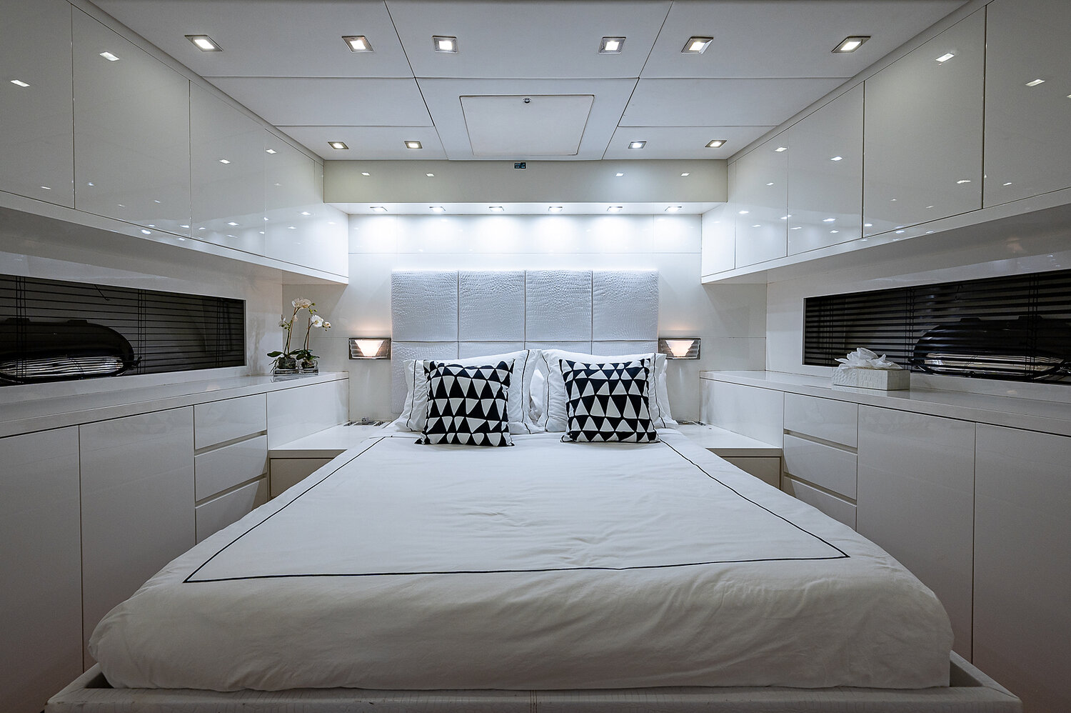 Below deck, the 101' Leopard sleeps up to 9 guests across four impeccably designed cabins, each with its own ensuite bathroom. The full-beam master stateroom offers a private sanctuary, while the additional cabins are perfect for family, friends, or corporate guests. With a crew of professionals attending to every detail, you can fully immerse yourself in the experience — whether it's jet skiing through turquoise waters, lounging with cocktails on the aft deck, or streaming your favorite playlist through the yacht’s high-end Bluetooth sound system.