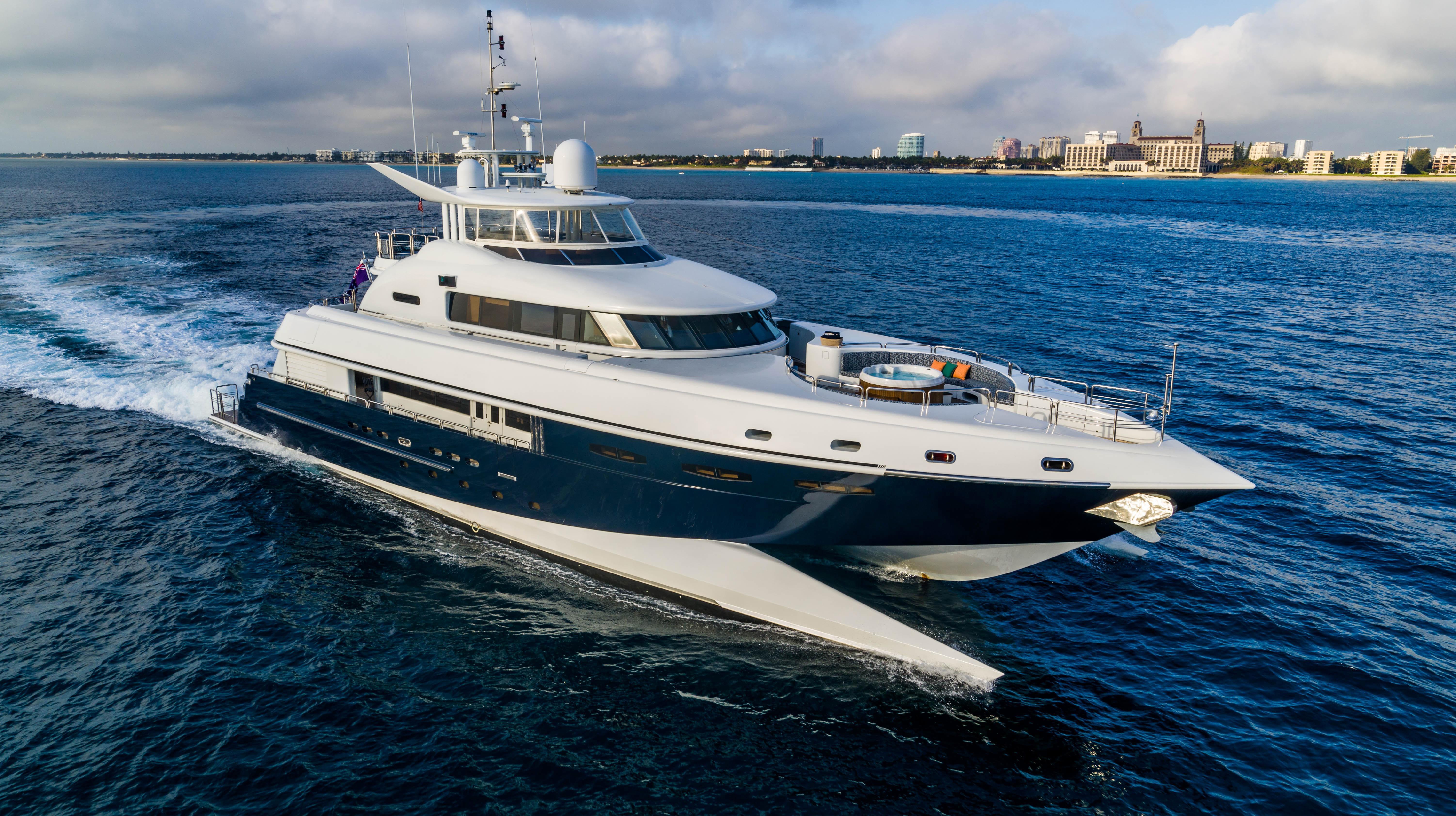 ![]() | 115' New ZealandFlorida and The Keys Bahamas (Nassau)Capacity Cruising: 12 Sleeping: 12 Staterooms: 5, Suite Bathrooms: 5 Beds: 1 King Bed, 2 Queen Beds, 2 Twin Side-By-Sides, 2 Pullmans Day: Captain, 2 Stew, First Mate, 1 Chef Term: Captain, 2 Stew, 2 First Mate, 1 Chef Specifications Length: 115 Feet Beam: 36 Feet Draft: 7 Feet Year: 2005 Refit: 2025 Special Features Starlink Bluetooth Sound System Hot Tub Bar With Stools Satellite TV Water Toys 2 Jetskis 2 Seabob Tender: 28ft, hp Paddleboards: 4 Fishing Poles Enough for 12 guests Snorkel Gear for 12 Floating Pool Summer Location: Bay Street Marina. E Bay St, Nassau, The Bahamas Winter Location: Bay Street Marina. E Bay St, Nassau, The Bahamas |