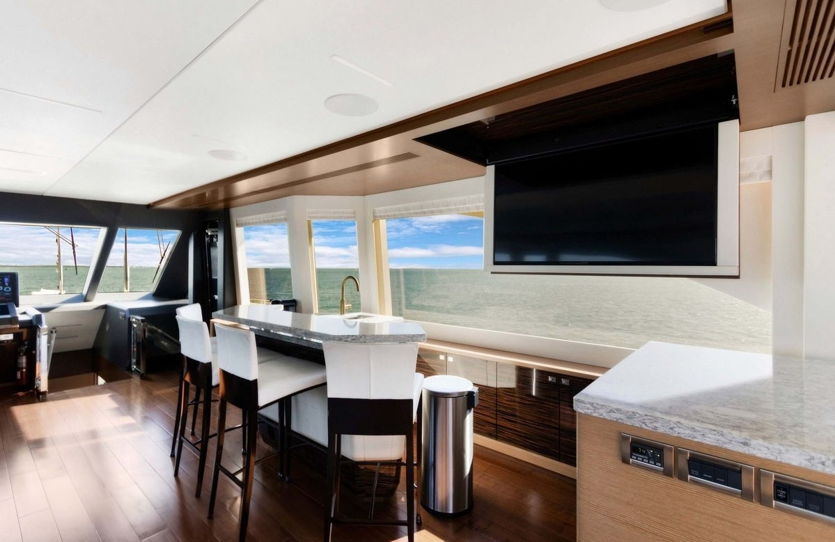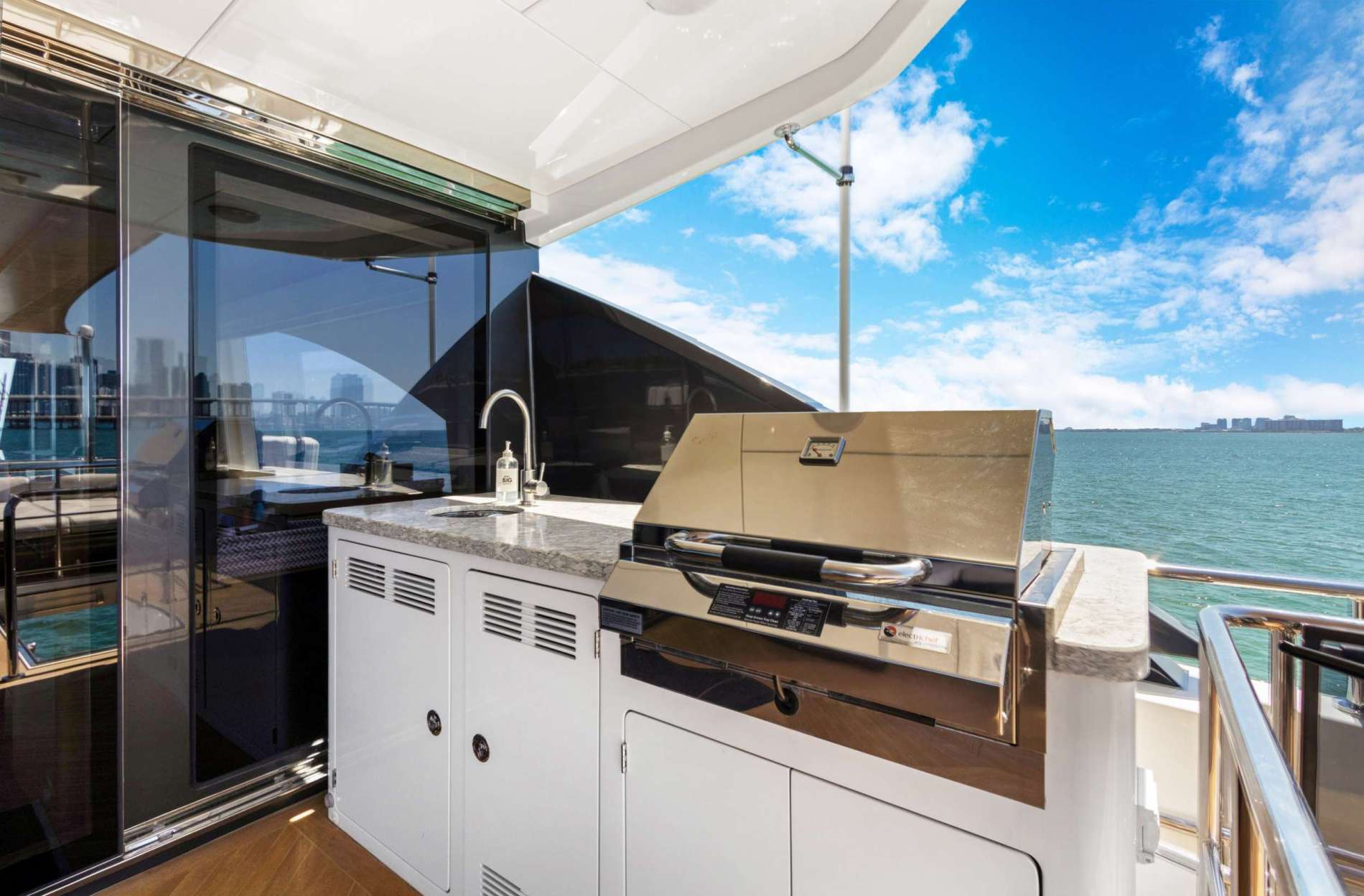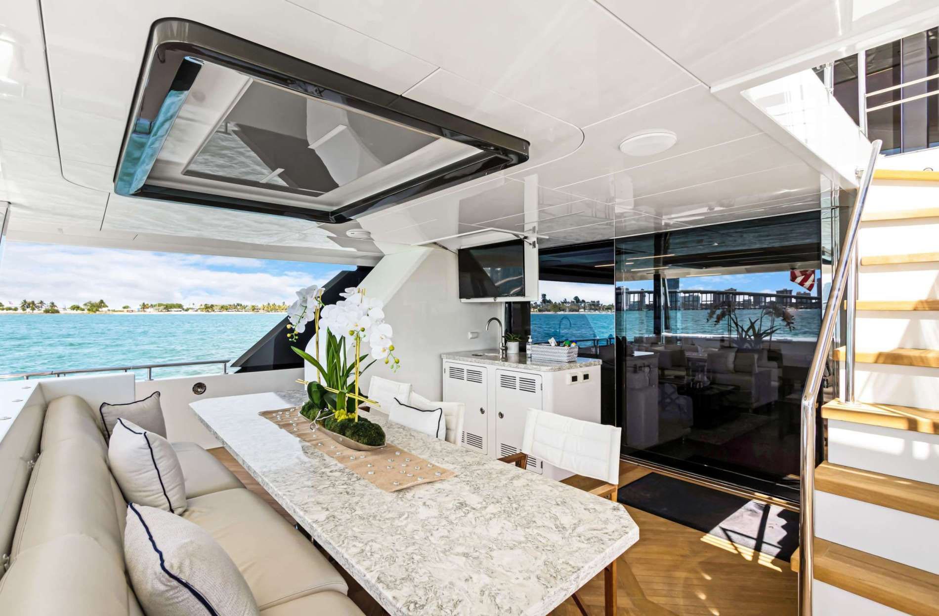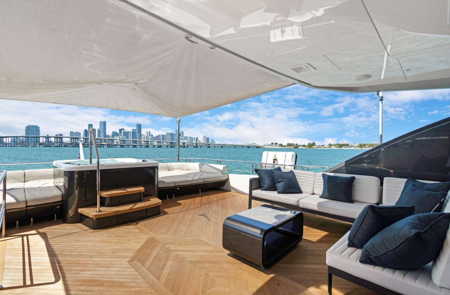Enjoy seamless indoor-outdoor living with a generous aft deck, elegant salon, and a flybridge complete with a hot tub and lounge seating. Stay connected with Wi-Fi, streaming TV, and a premium Bluetooth sound system. For adventure seekers, the yacht comes equipped with water toys, snorkel gear, floating mats, and more. A professional captain and crew ensure a first-class charter experience from start to finish, whether you’re cruising South Florida or island-hopping in the Bahamas.