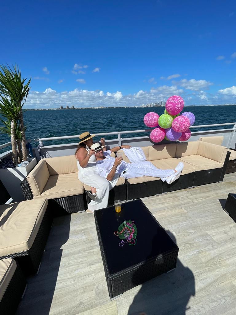 This yacht features two decks, with ample space for dancing, lounging, and enjoying the scenery while sipping on your favorite drink. The upper deck provides the best views of Miami's skyline and surrounding waters.