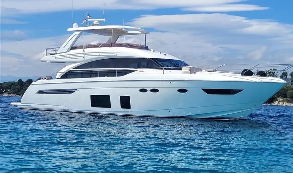 The Princess 68 is a luxury flybridge motor yacht known for its sleek design, spacious interior, high-performance capabilities, and large flybridge with a helm, dining area, and sunbathing spots. Key features include a unique aft-galley layout, expansive windows for natural light, a comfortable main salon, and accommodations for 8 in four staterooms with the owner's suite accessed via a private stairwell.