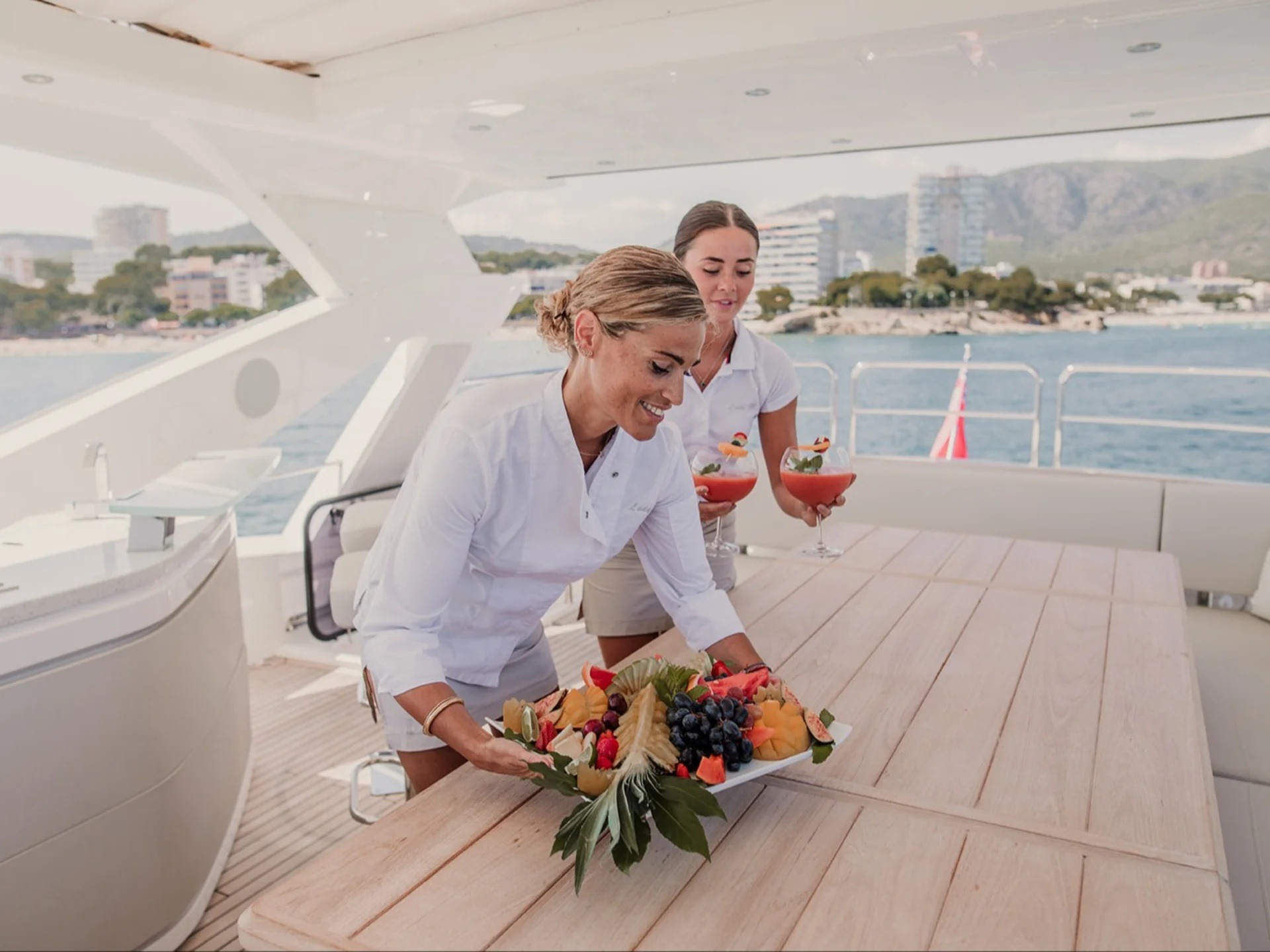![]() Charter our 76 Sunseeker Yacht and receive a blend of luxury, performance, and versatile spaces, featuring spacious interiors with panoramic views, a flybridge with lots of seating and a bar. The stern of the boat has an impressive "mini beach club" with a hydraulic platform. The yacht offers high-speed cruising, comfortable accommodations for up to eight guests in four cabins, and a host of amenities, making it ideal for exploring coastlines, enjoying watersports, entertaining, or relaxing in the many different seating options and sunning areas. Come aboard and let our full time crew ( captain, stew and chef) pamper you and create an experience of total luxury aboard one of the nicest yachts of her size. | 76' SunseekerEurope and MediterraneanCapacity Cruising: 12 Sleeping: 8 Staterooms: 4, Suite Bathrooms: 4 Beds: 1 King Bed, 1 Queen Bed, 1 Full Bed, 1 Twin Side-By-Side Day: Captain, Stew, 1 Chef Specifications Length: 76 Feet Beam: 18 Feet Draft: 6 Feet Year: 2019 Special Features Wifi Bluetooth Sound System Bar With Stools Satellite TV Water Toys Seabob Tender: 12ft, 90hp Paddleboards: 1 Snorkel Gear for 8 Pickup Address: Mallorca, Spain |
